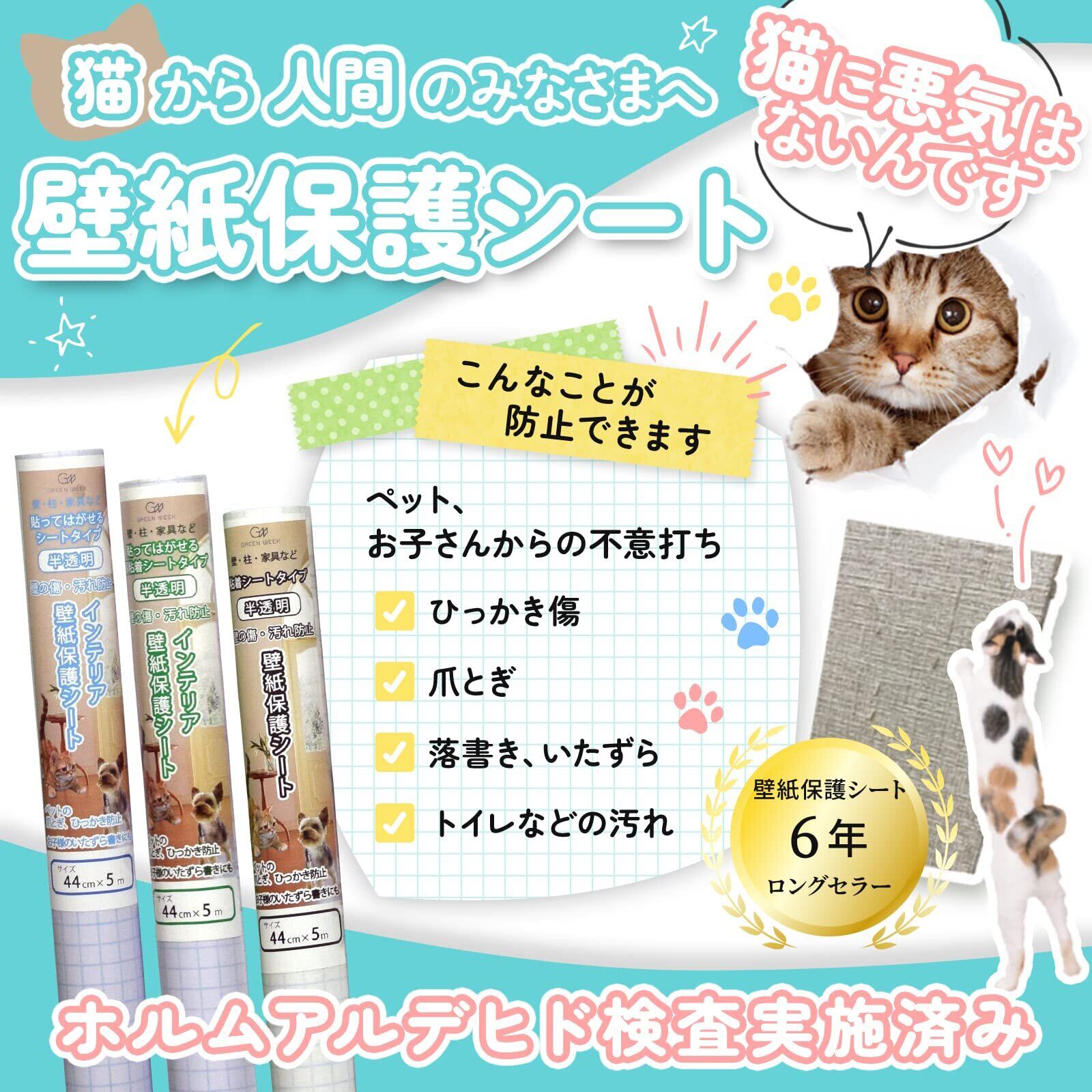 グリーンウィーク ペット壁紙保護シート 44cm×5m (はがせる粘着タイプ 標準) 半透明 壁の傷、汚れ、ペットしつけ、猫ひっかき防止