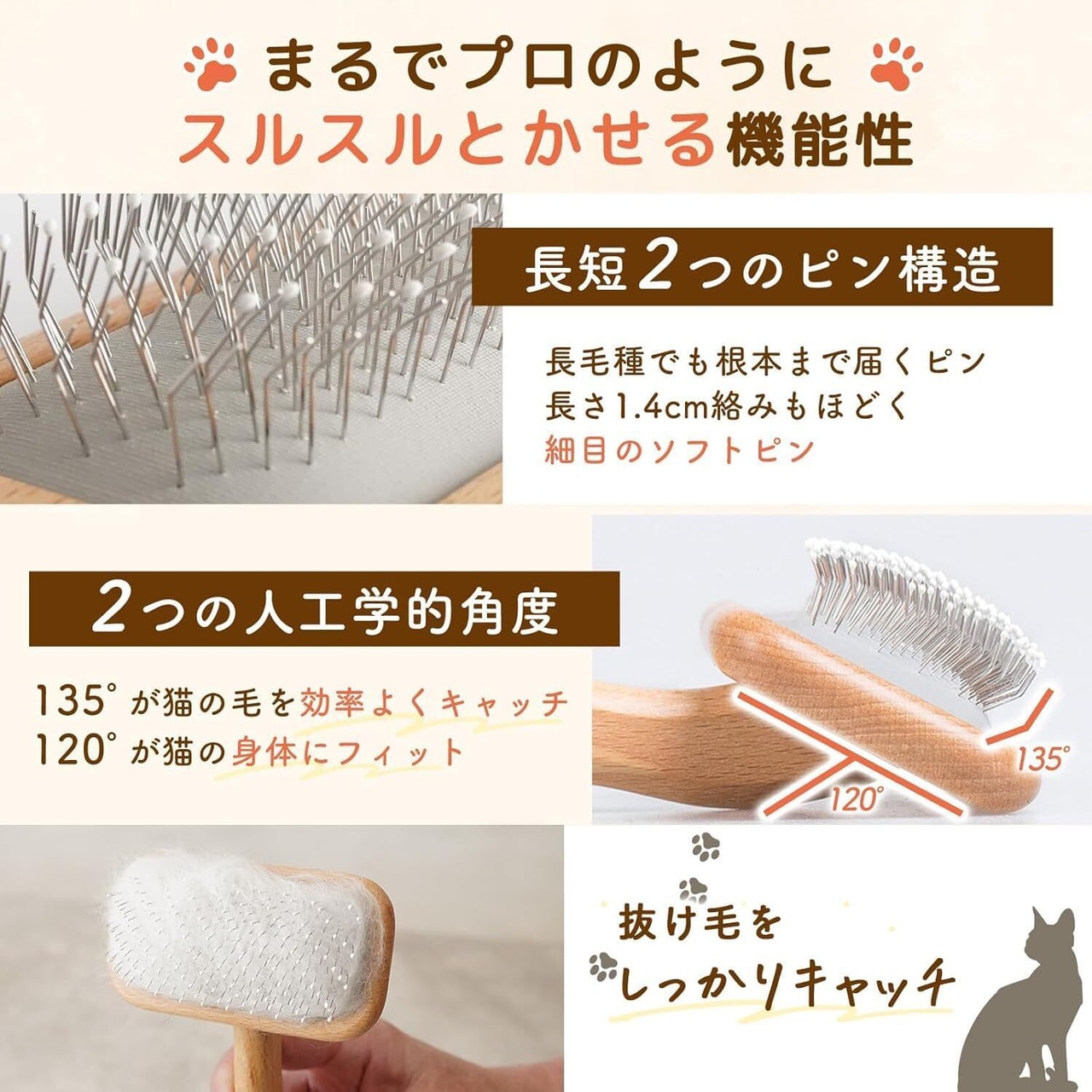 【毛をしっかりとかす】人工学的に設計された135°に曲がったピン設計と、細いソフトピンが猫ちゃんの毛を根本からしっかりとかします。