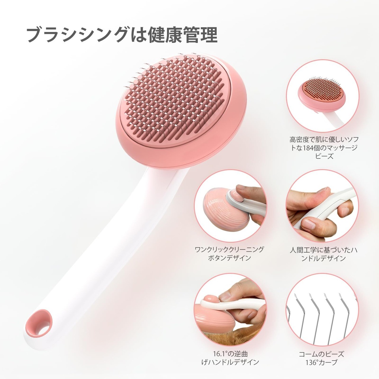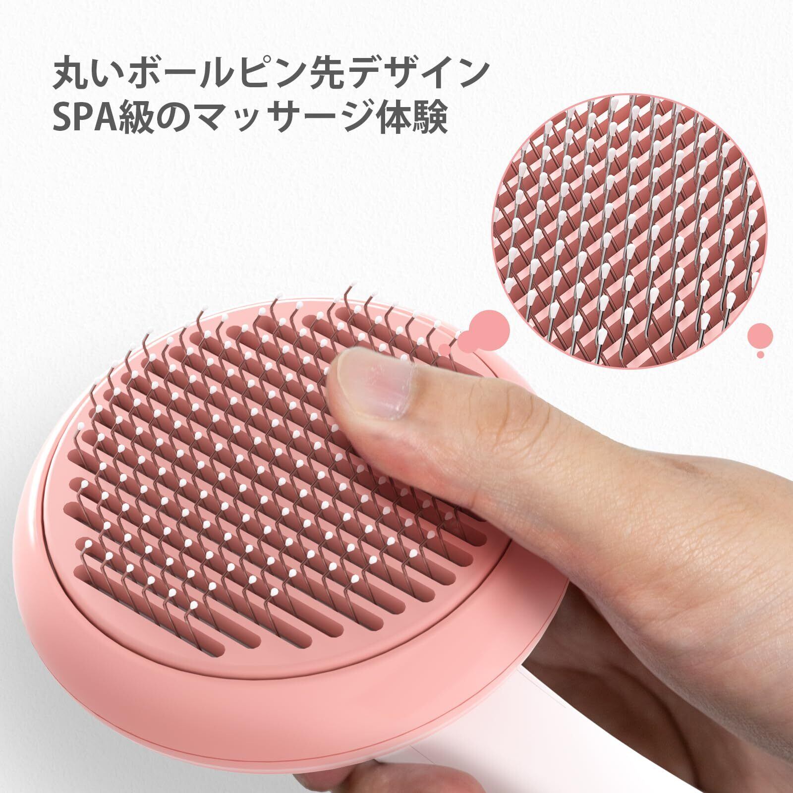 【お掃除が楽に】136°曲げステンレス針デザインはペットの毛の中に入り込んで掃除するように設計されています。ペットブラシは、長期使用しても変形することはありません。のコーム先端は丸いビーズ状に設計されています。 他のコームと比べて、鋭利な針目がないので、ペットの皮膚を傷つけることはありません。この猫ブラシは高密度で肌に優しいソフトな184個のマッサージビーズを備え、コーミングがペットにSPA のような心地よさを感じさせ、且つペットの肌を傷つけません。