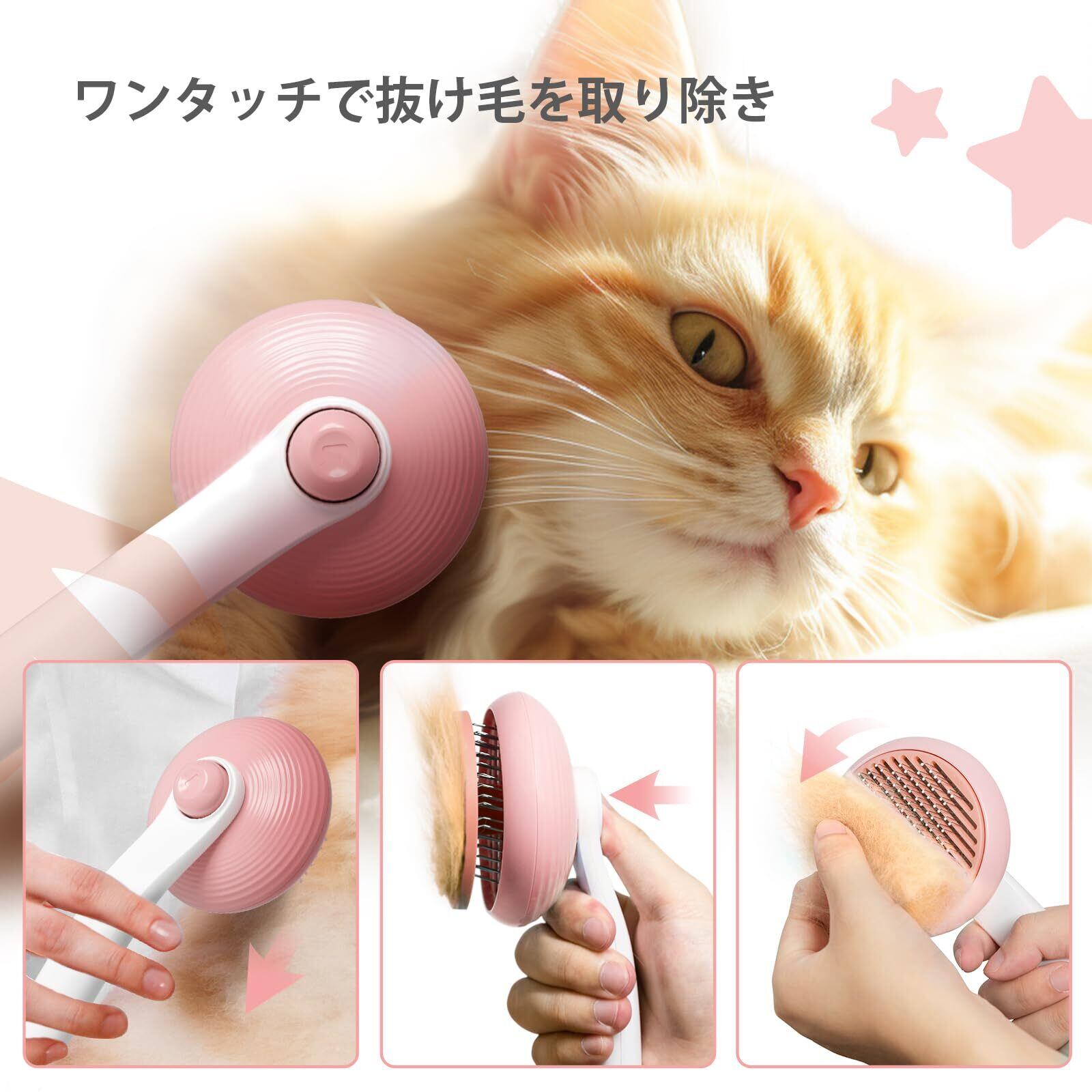 【ワンタッチで簡単にお掃除】ワンタッチ抜け毛除去機能を搭載したブラシです。柄のボタンを押して、抜けた毛を完 全に押し出し、楽に掃除できる。さらに、尾端には丸形の穴が付いており、使用しない時は、ストラップを繋がる と、壁にぶら下がられ、収納しやすいです 。
