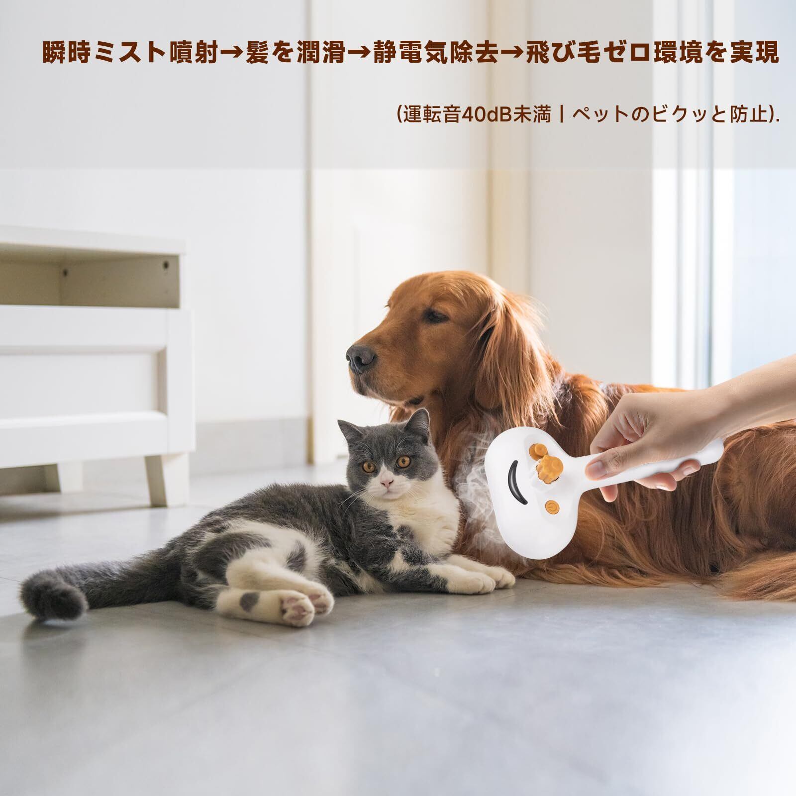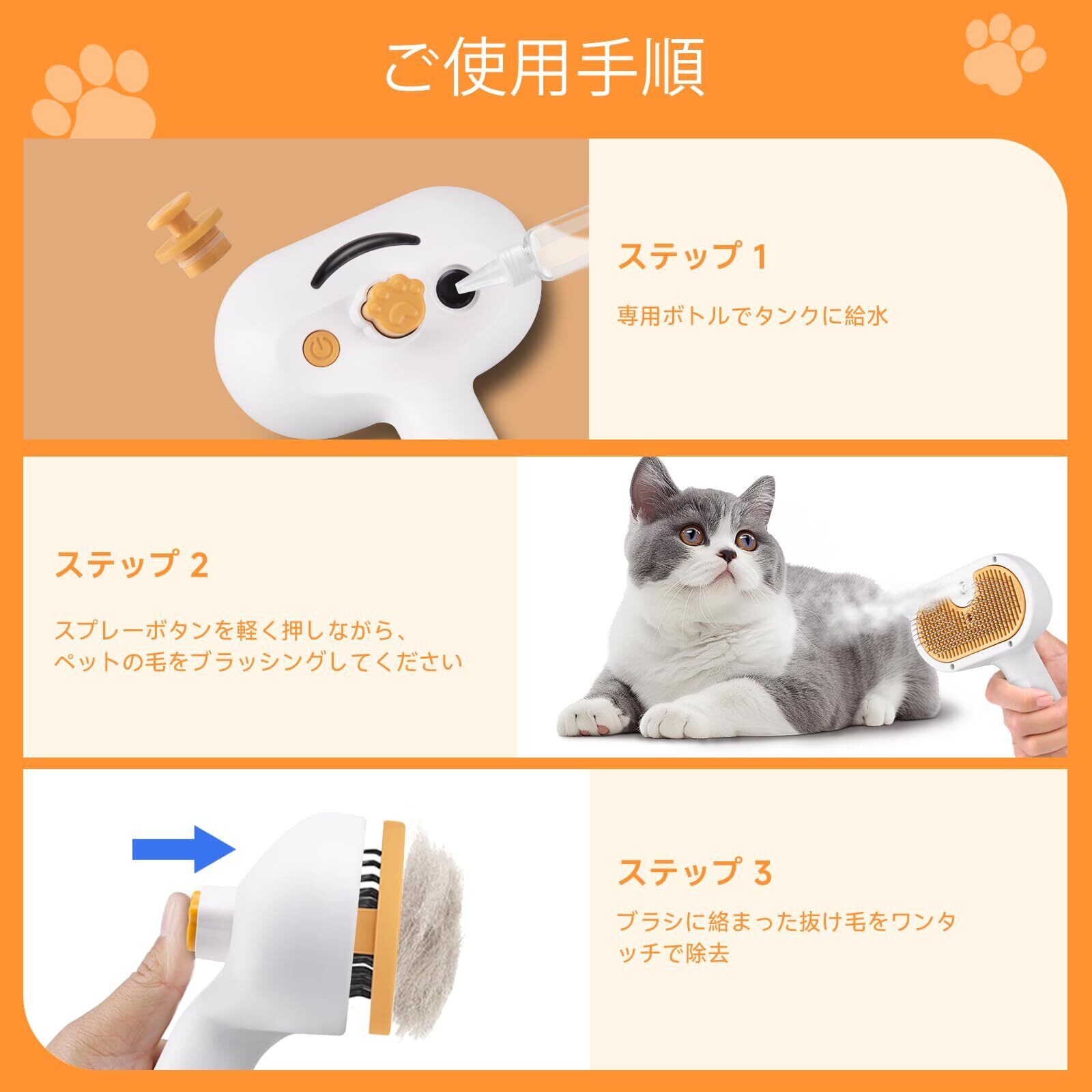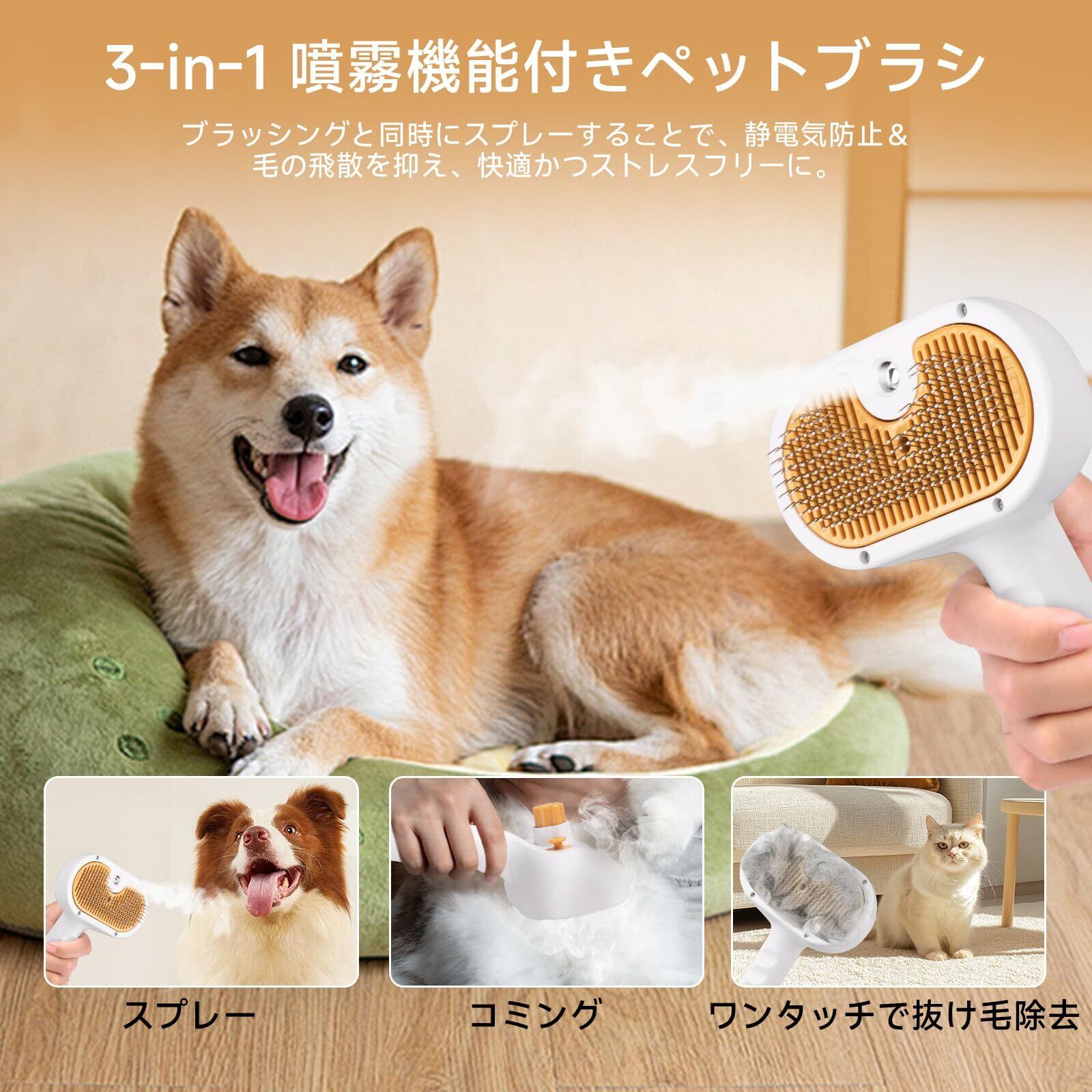 猫 ブラシ スチーム|スチームブラシ&ミストブラシ|ワンプッシュ式 3-in-1 ペット用グルーミングブラシ|USB充電式|静電気防止 マッサージ スリッカーブラシ|犬猫兼用 短毛・長毛対応|肌に優しい設計|洗い流し不要の美容液付き
