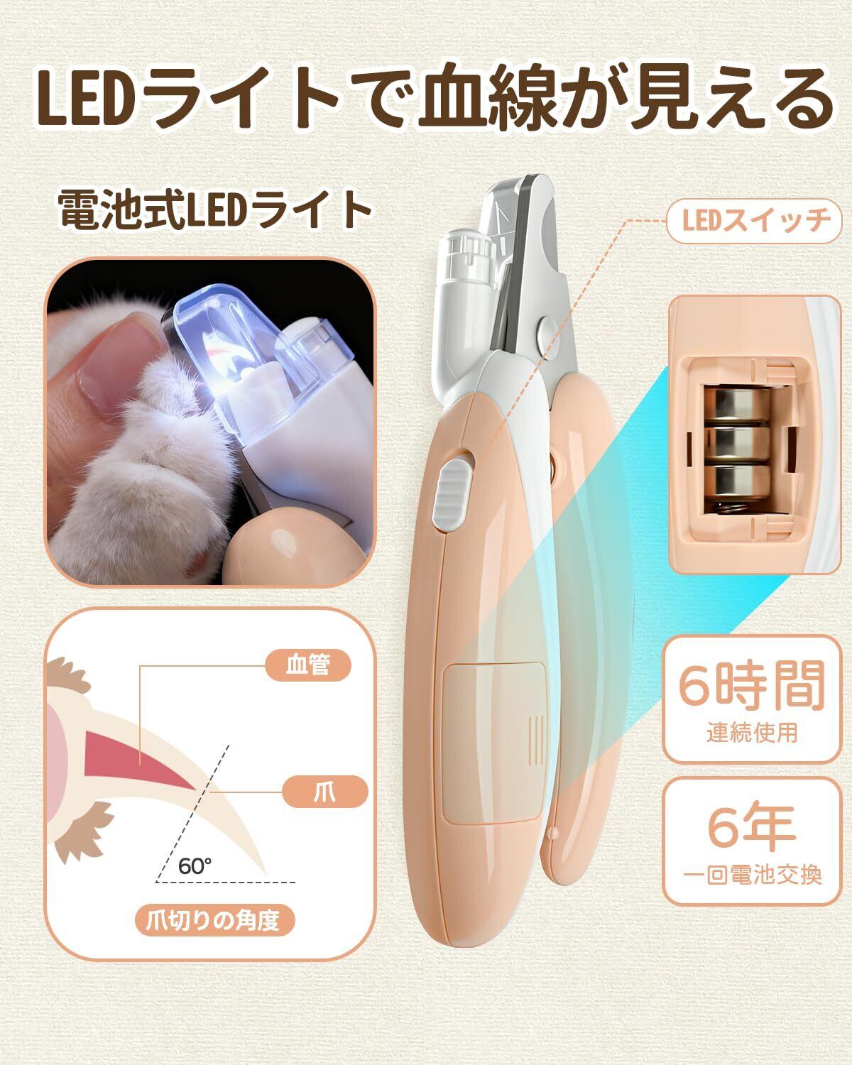 【安全性確保!血管が見えるLEDライト!】獣医師監修LEDライト付き猫爪切りはライトで爪を透かし、爪先の神経と血管がひと目で確認できるので、血管を避けて安全な爪切りができ、ペットも爪切りに怖い思い出を残しません。ポタン電池が内蔵し、約六時間使え続けます。猫の爪切りは1か月に1回とすれば、内蔵電池は最大6年ほど使用可能です。