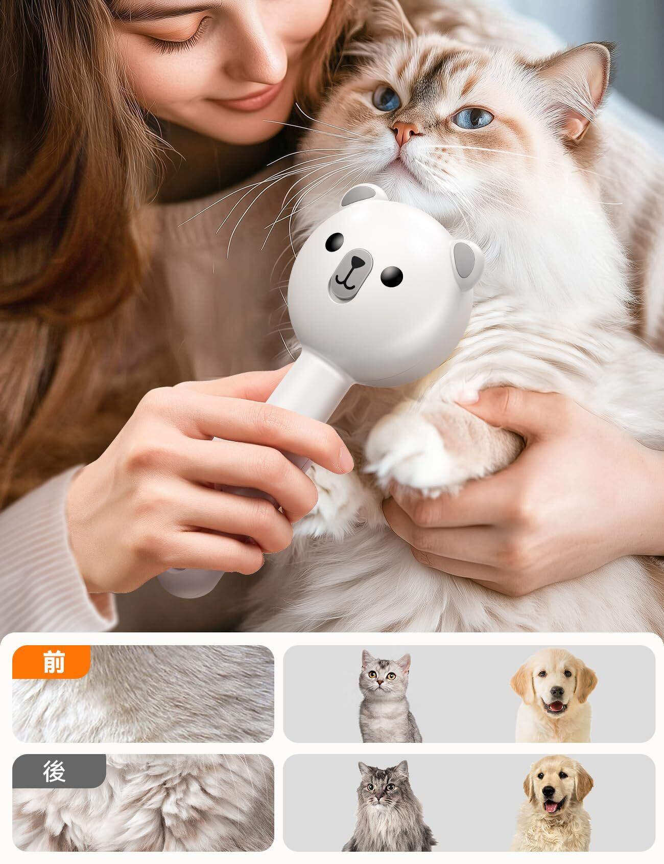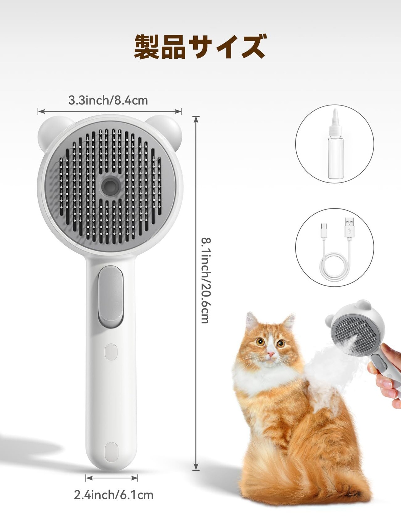 3in1多機能猫スチームブラシ: 脱毛、洗浄、マッサージ機能を兼ね備えた多機能猫グルーミングブラシです。 水タンクに水、消臭剤などを入れて、噴霧スイッチを押すだけで、噴霧機能を起動できて水が超音波化にされ、繊細なミストを吹き出します。浮き毛を取り除きながら、静電気、乾燥にも対応できるようになりました。スチームの柔らかな力で、従来のドライブラッシングよりも効果的にペットの被毛の汚れやフケを取り除きます。 ご注意:当社の猫ブラシは水をスプレーに変えるだけで、加熱工程はありません。