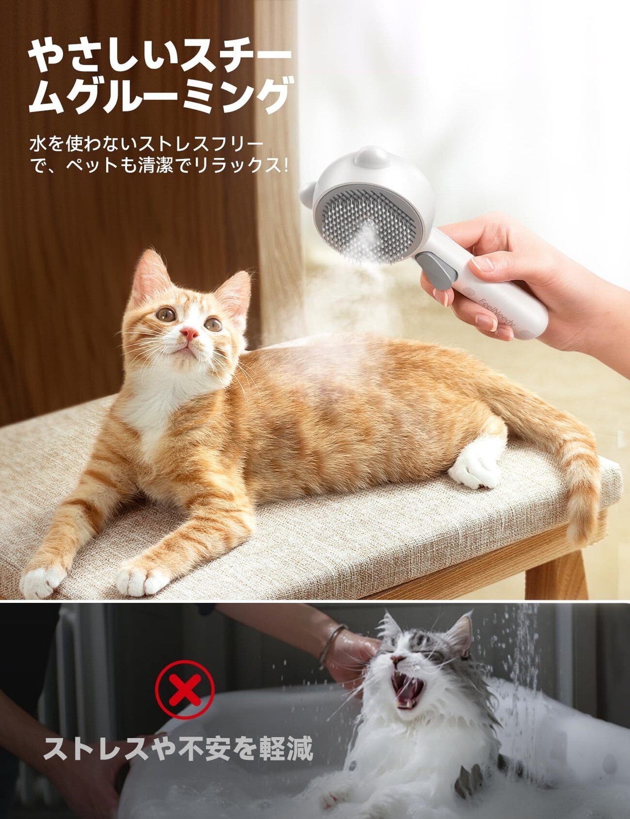猫ブラシ スチーム ワンプッシュ式 蒸し猫ブラシ FEELNEEDY ペット用ブラシ 抜け毛除去簡単 噴霧式 ペットグルーミングブラシ マッサージ スリッカーブラシ 静電防止 USB充電式 犬猫通用 短毛 長毛 丸洗い可能 皮膚に優しいブラシ ホワイト