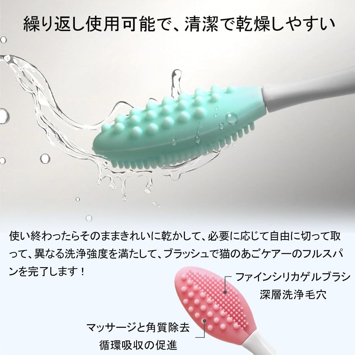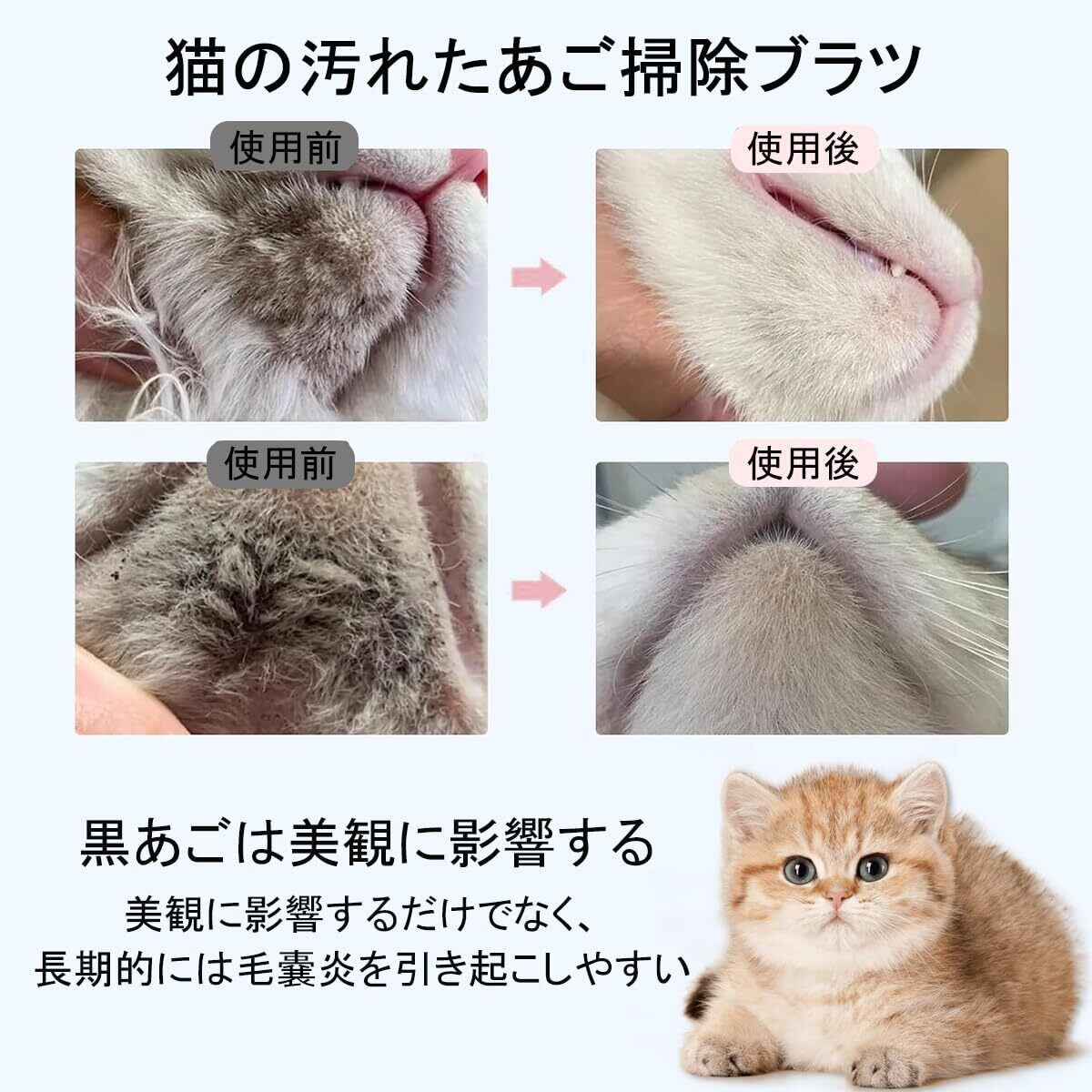 【両面多機能設計】片面は細く柔らかい歯で、日常の温和な清潔とマッサージに適している。もう一方は洗浄面を強化するため、油脂と死皮を簡単に取り除くことができる。必要に応じて自由に切り替えて、異なる洗浄強度を満たして、ブラシで猫のあごケアの全ステップを完了します!