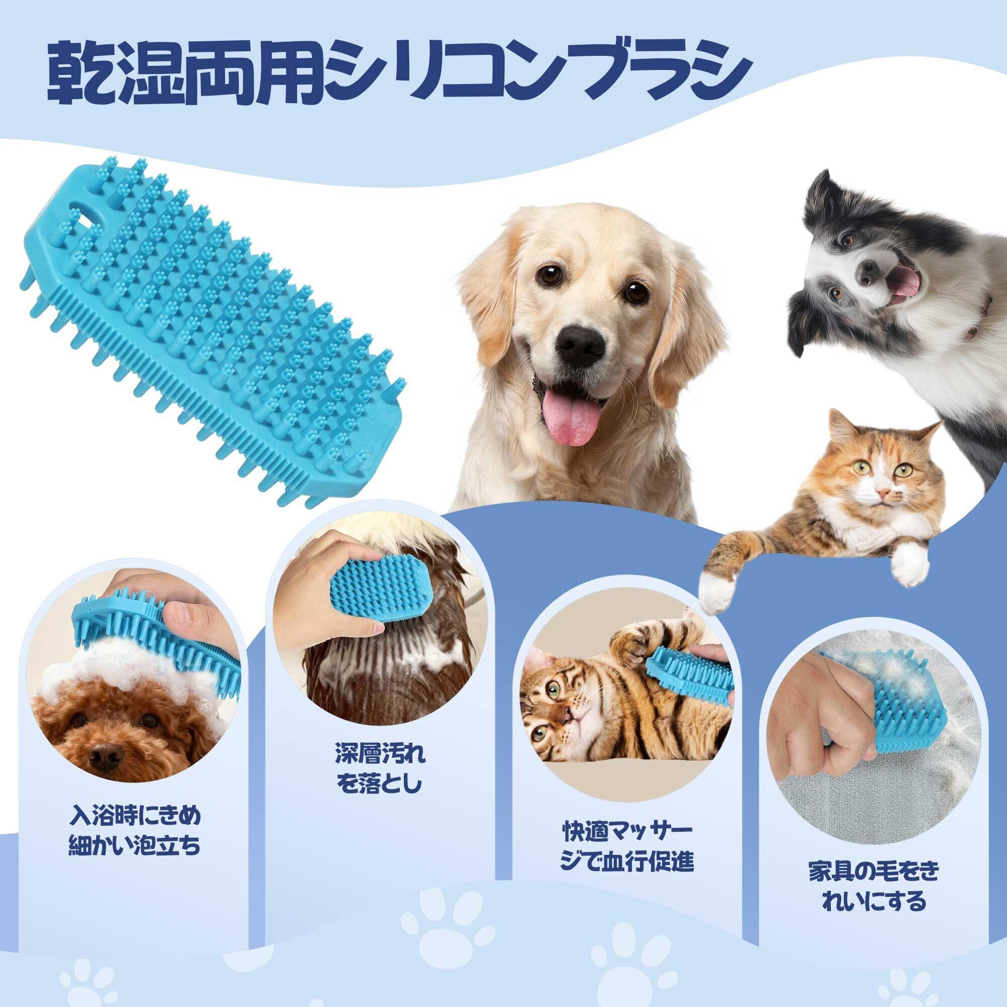 ④ シリコンブラシ(犬猫兼用)— 抜け毛取り+洗浄+シャンプー+マッサージ 108本の梳き歯と432個のシリコン突起が、浮き毛を優しく取り除きつつ皮膚の汚れもすっきり洗浄。 犬 シャンプーブラシ・猫 シャンプーブラシ として、ドライ・ウェット両用で入浴時の泡立ちも抜群。 マッサージ効果で血行促進し、毛の乾燥を防ぎながらリラックス効果を与えます。