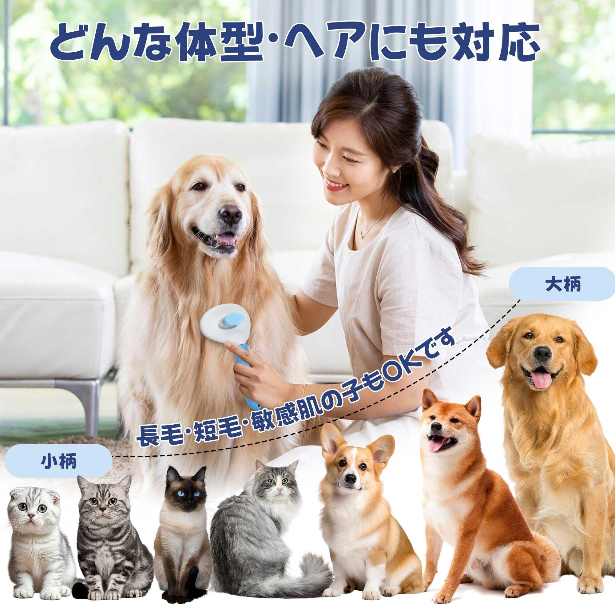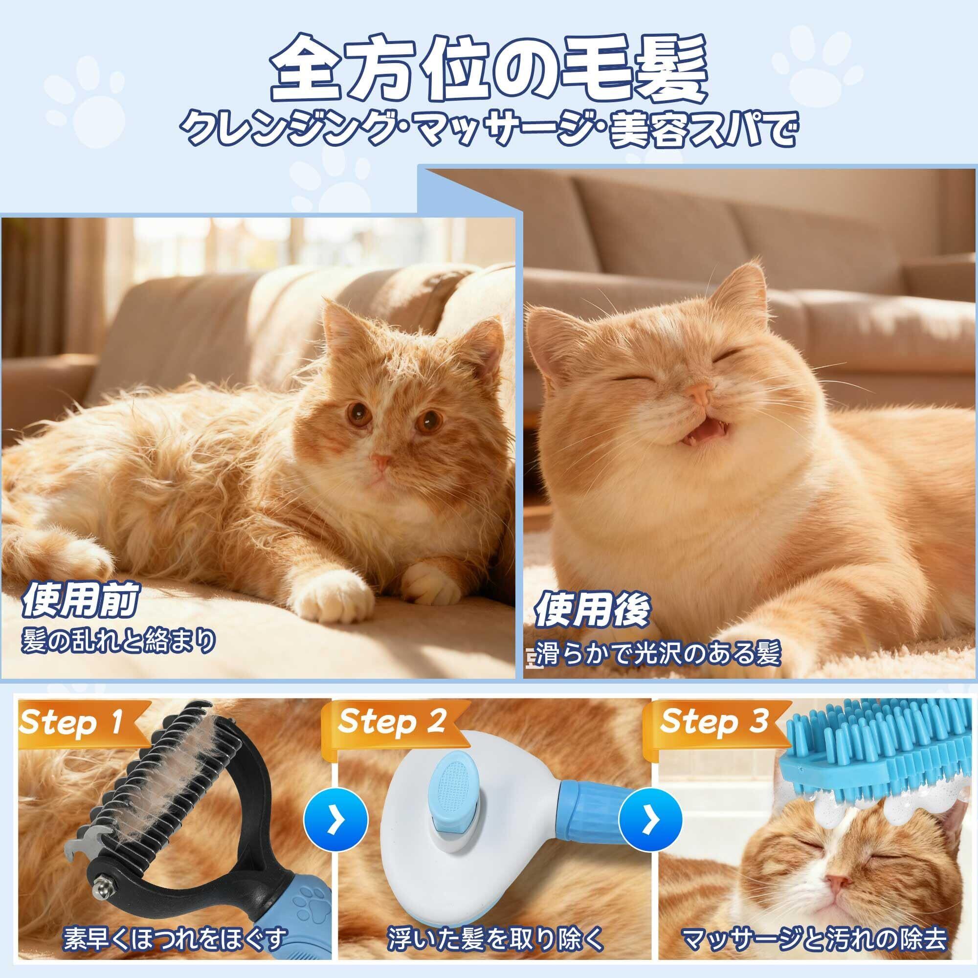 ⑤ 使いやすい&清潔簡単 — 全パーツ水洗いOK、犬猫すべての毛長に対応 滑り止め付き人間工学ハンドルで握りやすく、長時間の使用でも疲れにくい。 3点すべて水洗い可能で速乾性があり、日常のお手入れも簡単。 犬用ブラシ・猫用ブラシ として、短毛・中毛・長毛すべての犬猫のグルーミング・抜け毛ケアに最適です。