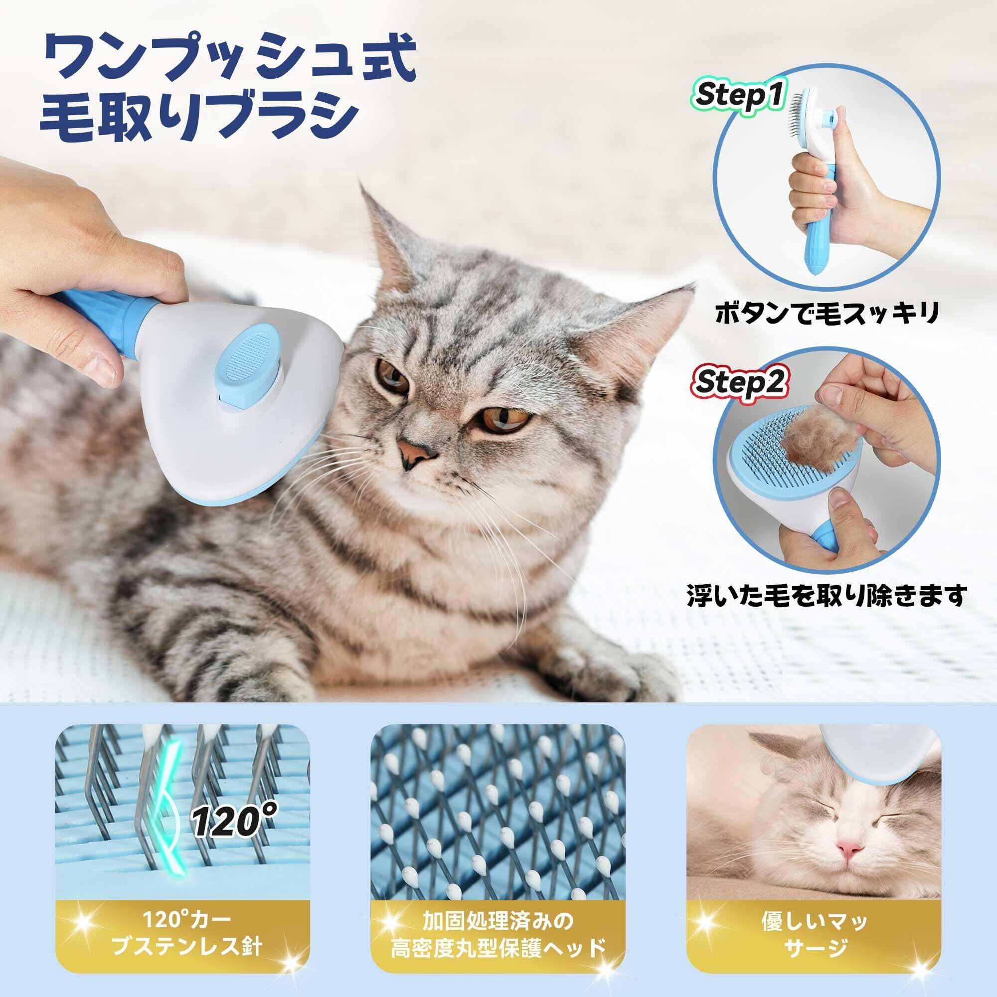 ② ワンプッシュ式スリッカーブラシ(犬猫用)— 抜け毛取り&静電防止&肌に優しい 120°カーブ設計の高品質ステンレス針が、犬の抜け毛取り・猫の抜け毛取り に最適。 静電防止コーティングで浮き毛をしっかりキャッチし、飛散を防止。 丸頭の針が皮膚を傷つけず、ボタンを押すだけで毛を素早く排出できる 自動クリーニング式ペットブラシ。