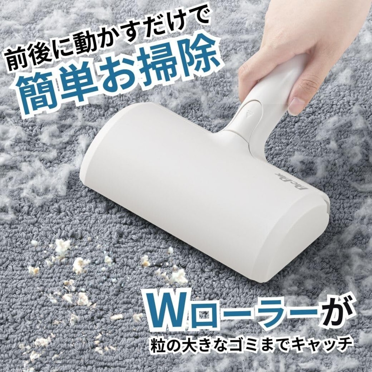【Wローラーでお掃除力アップ】従来のぱくぱくローラーから進化したWローラー効果で、今まで取れなかった猫砂やお菓子のくず等の小さい固形物までお掃除することができます。チケットブラシとロールタイプでごみをキャッチし、猫の毛や犬の毛を取る抜け毛掃除の効果だけでなく、カーペットについた綿ほこりや髪の毛もぱくぱくします。