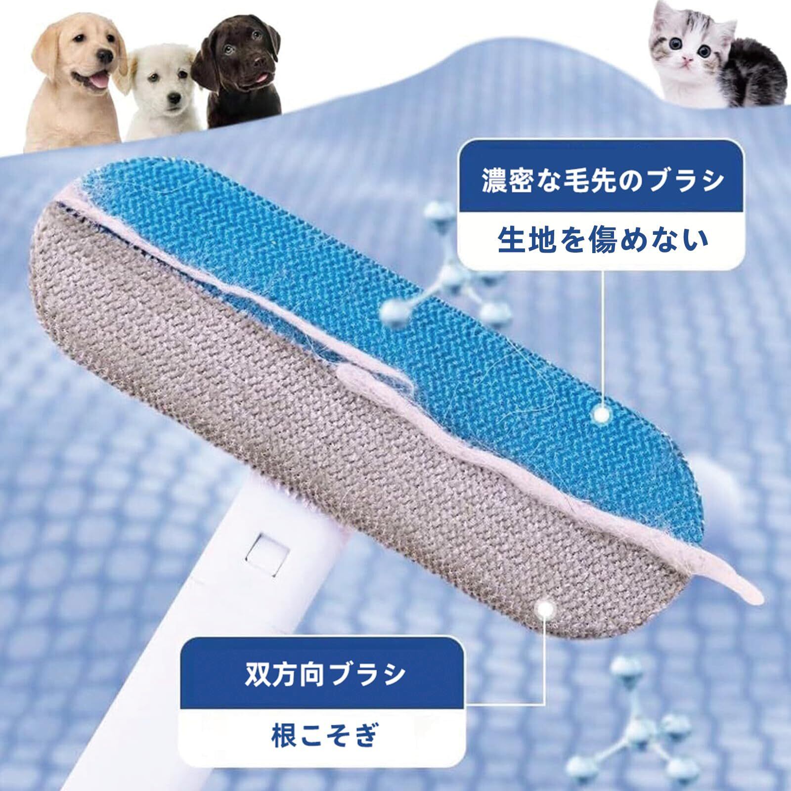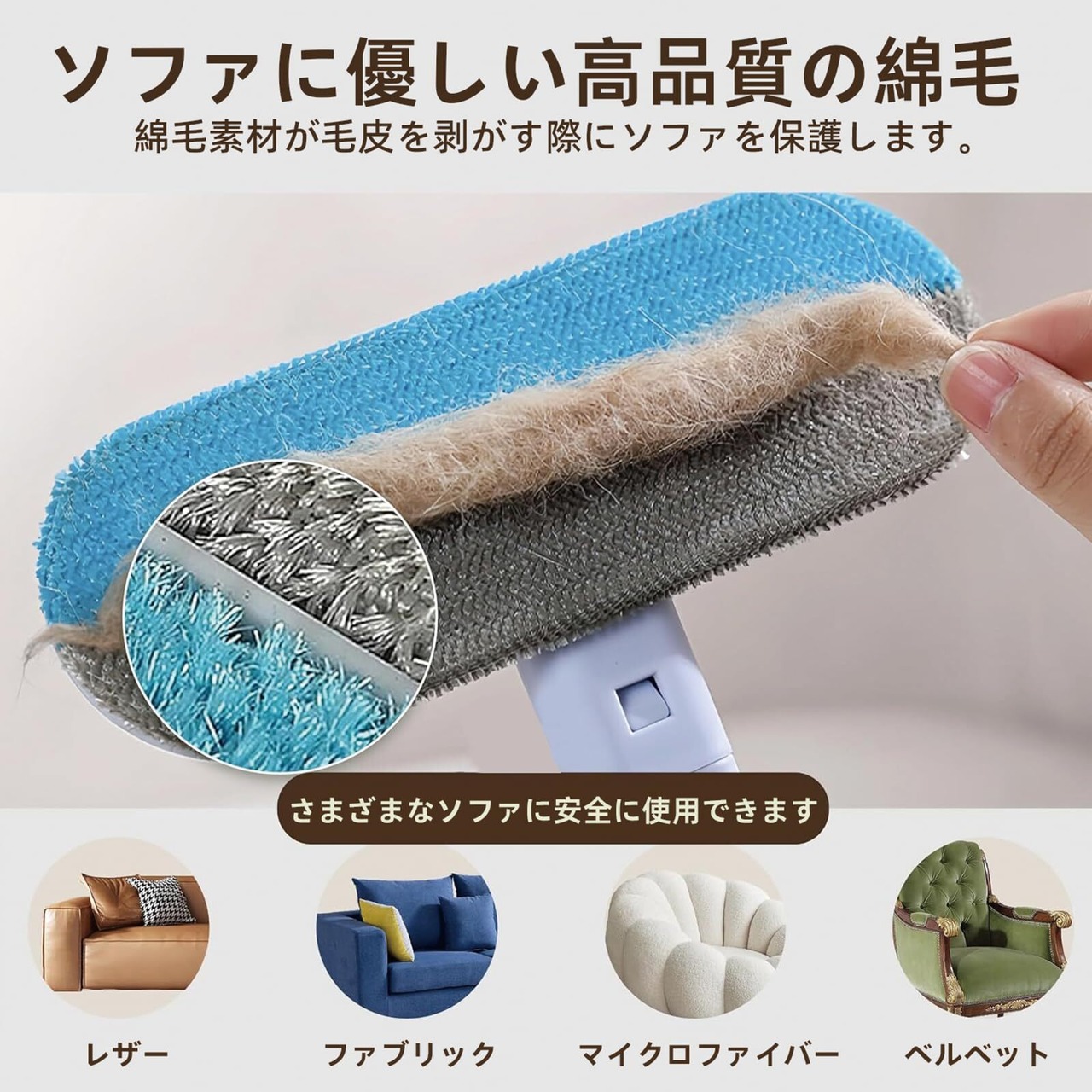 ファブリックと家具を保護: 室内装飾品の完全性を損なうことなく、ペットの抜け毛を確実に除去する、優しく傷つけない毛で家具を保護します