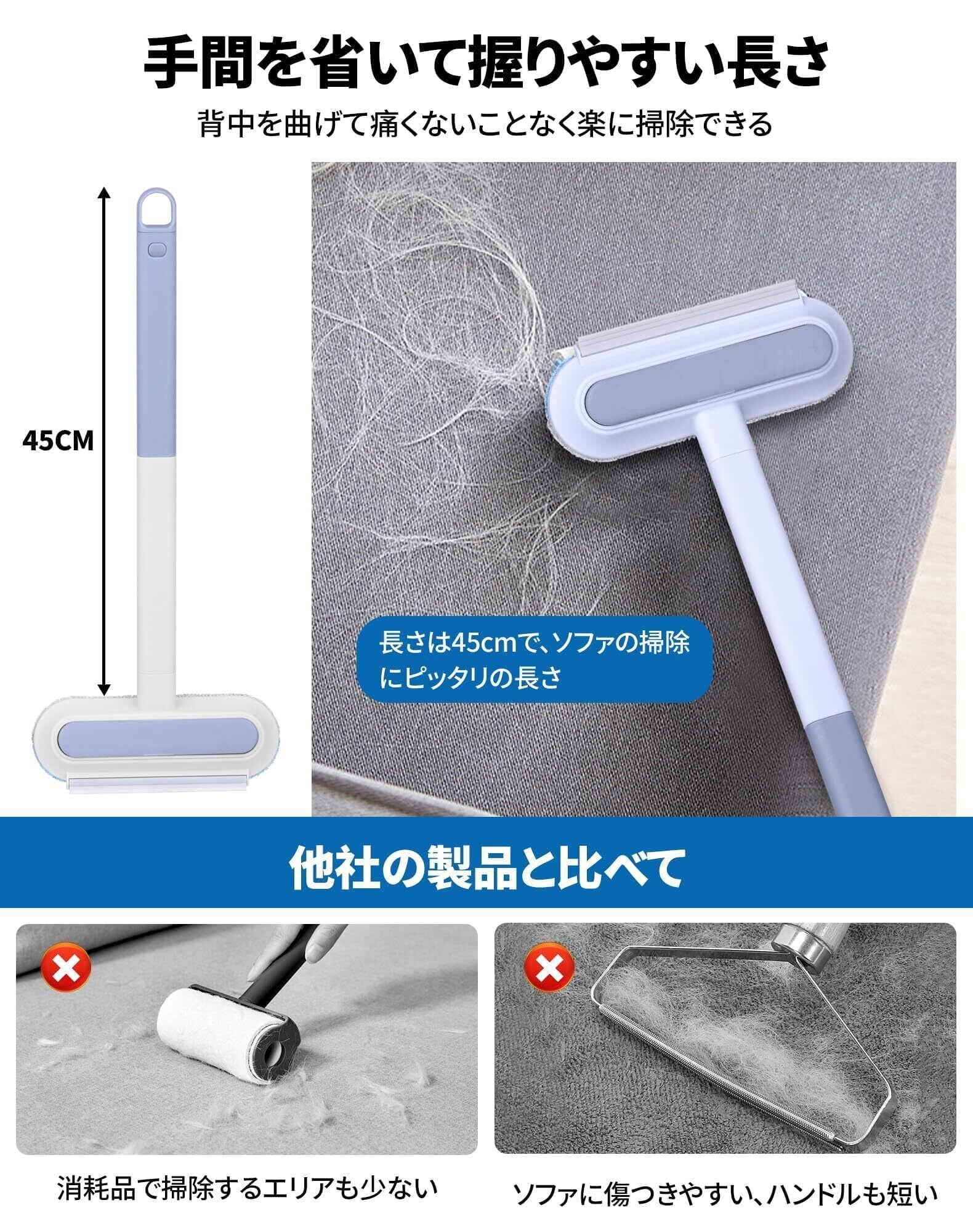 【長さ調節可能なハンドル】ペットの毛取りブラシは持ちやすい触り心地の良いABS製ハンドルを採用しています。また、ハンドルは2段階で組み合わせることができるので、必要に応じてハンドルを分解したり組み合わせたりして長さを調節でき、掃除や掃除も楽に行えます。ハンドルの設置面とブラシヘッドの装着面は30度の傾斜があり、握り心地が良く滑らかで、力加減もちょうどいいです。