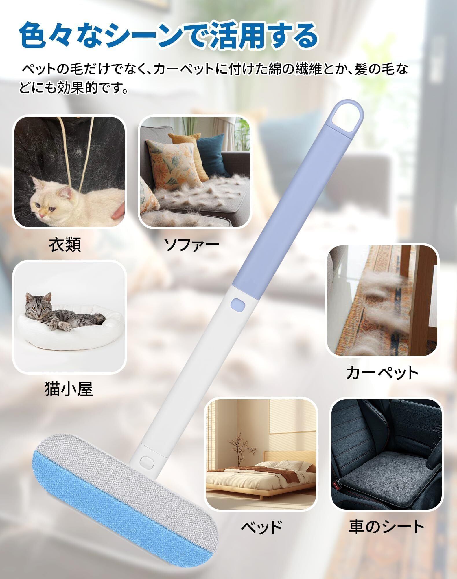 【ペットの抜け毛や綿埃対策】この猫の毛取りブラシは、猫や犬の毛を効果的に取り除くだけでなく、カーペットから綿埃や髪の毛も効果的に取り除くことができます。取れにくい布団、ベット、ソファー等の場所についた抜け毛を前後に動かすだけできれいにキャッチできるお掃除リーナーです。