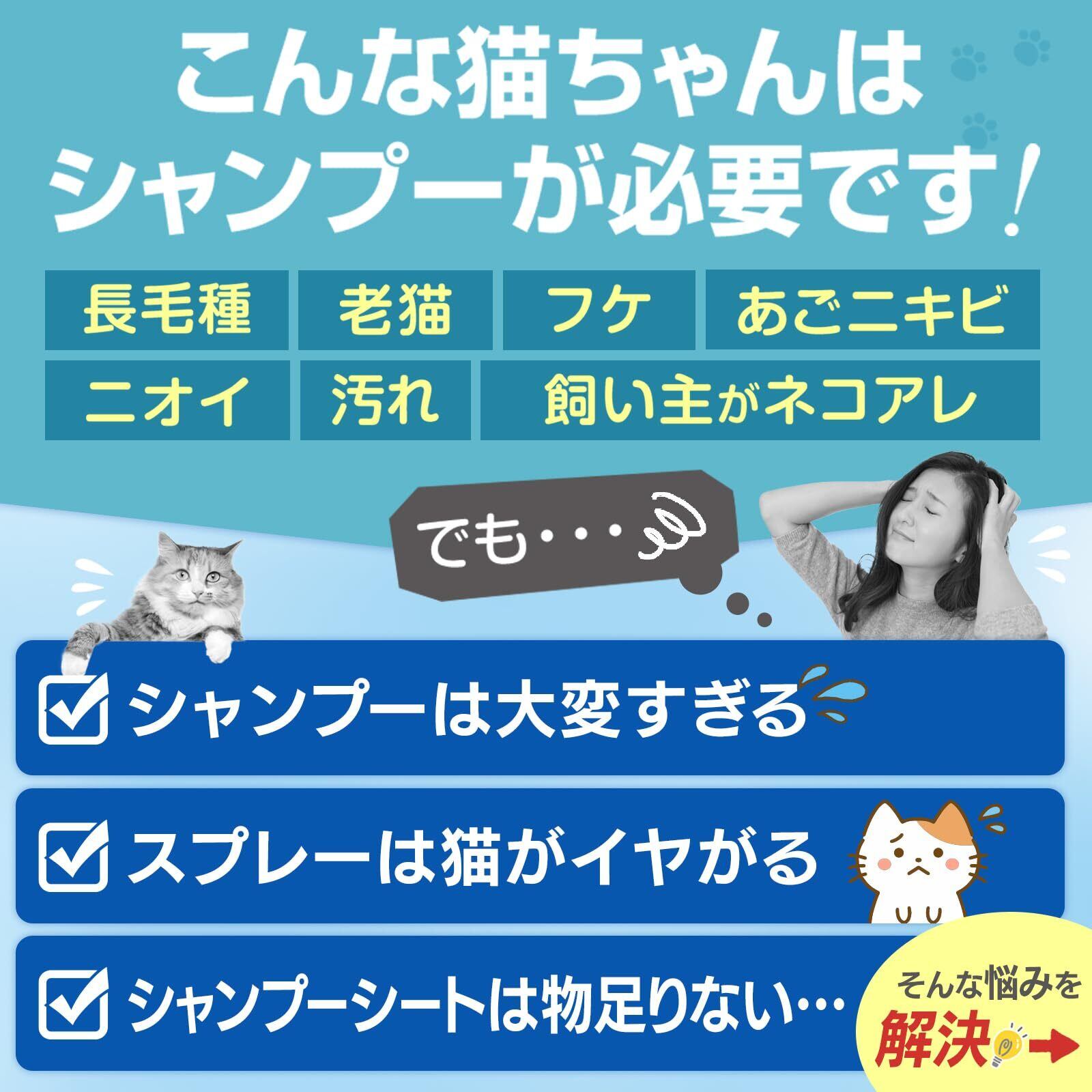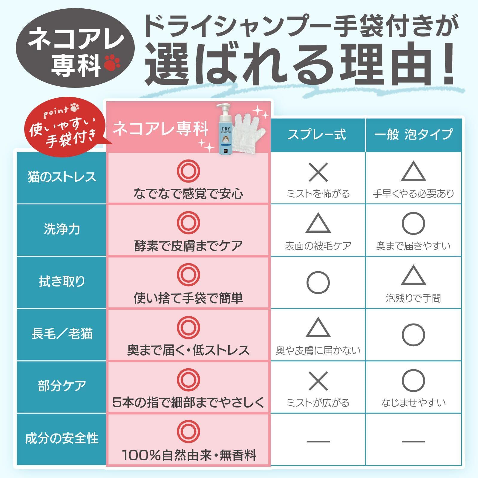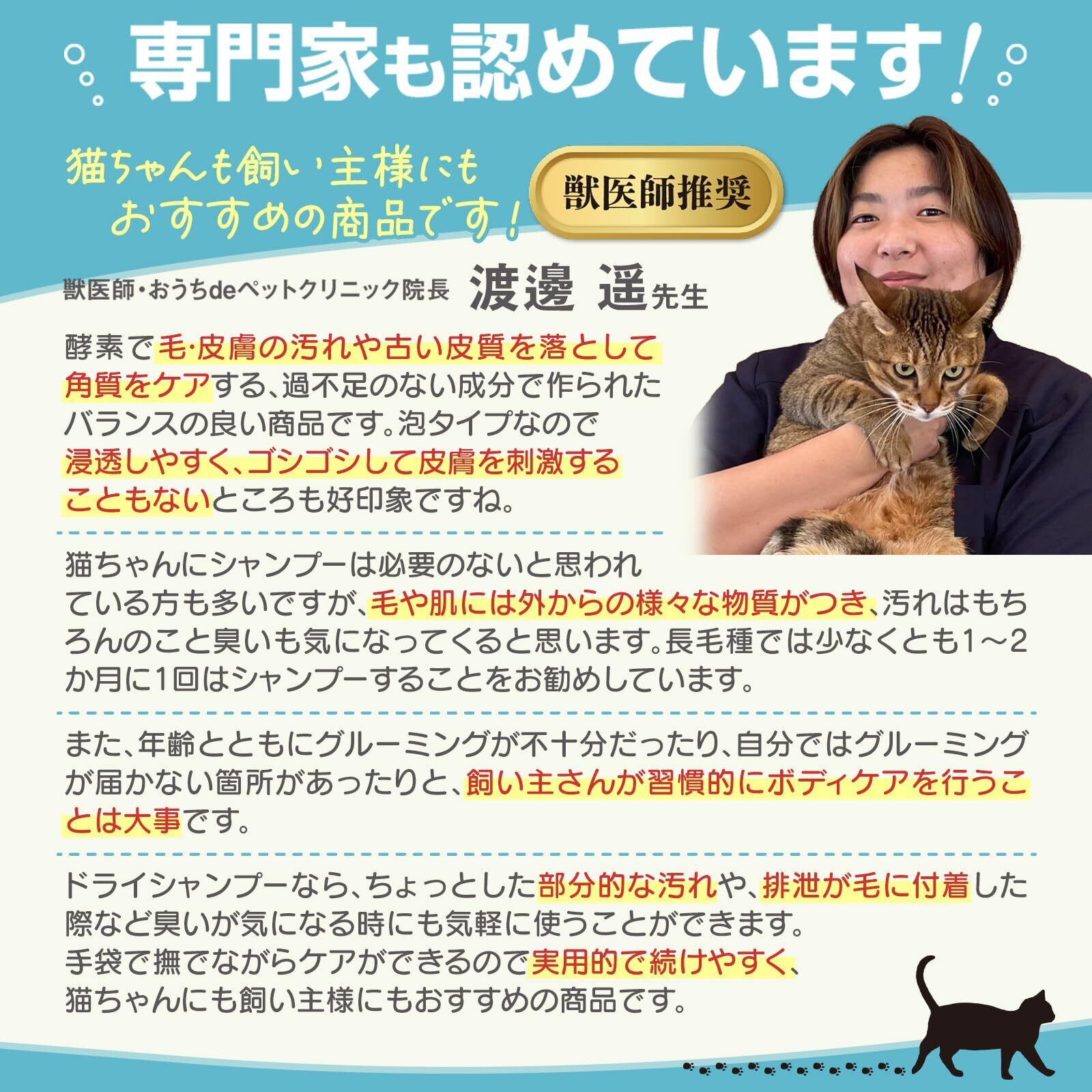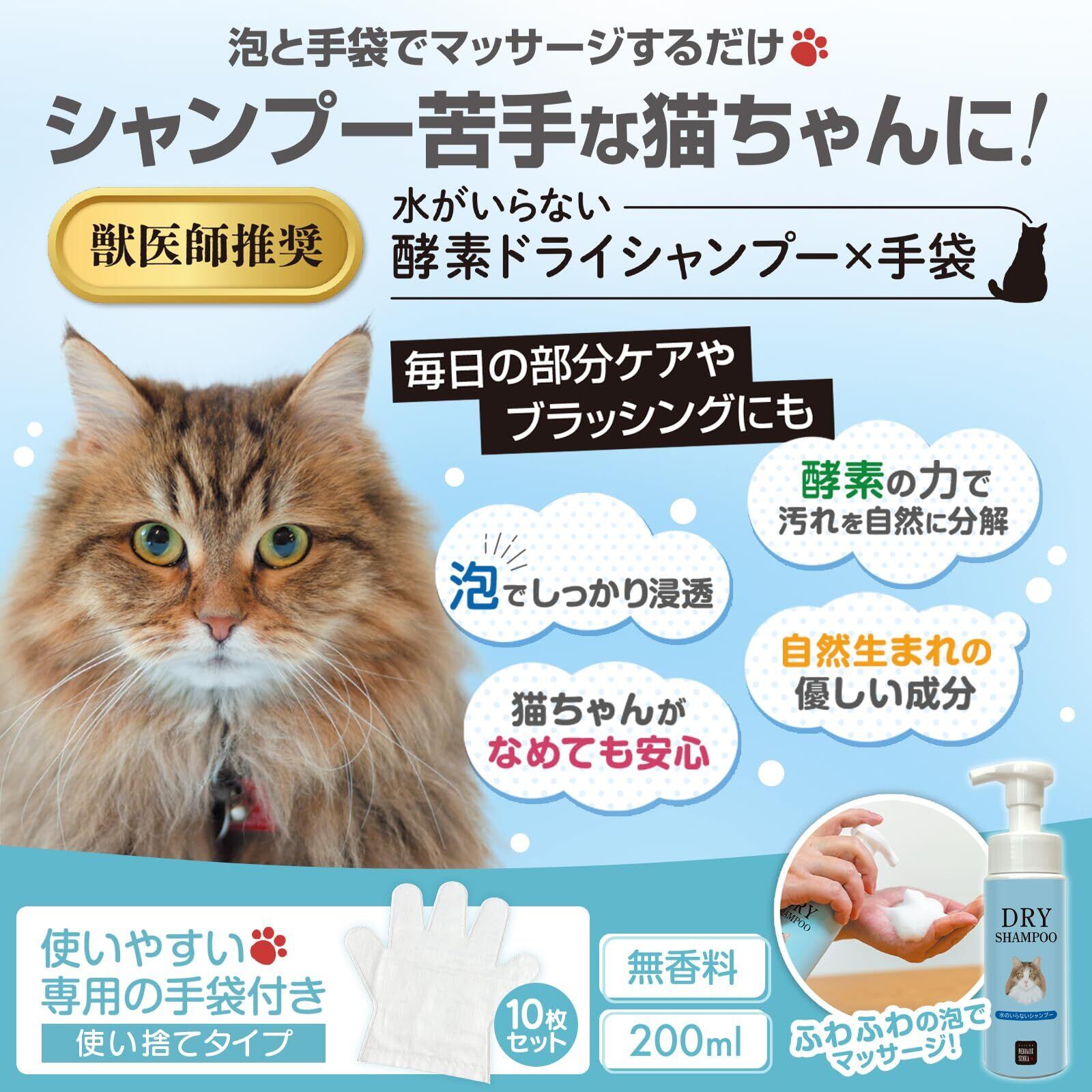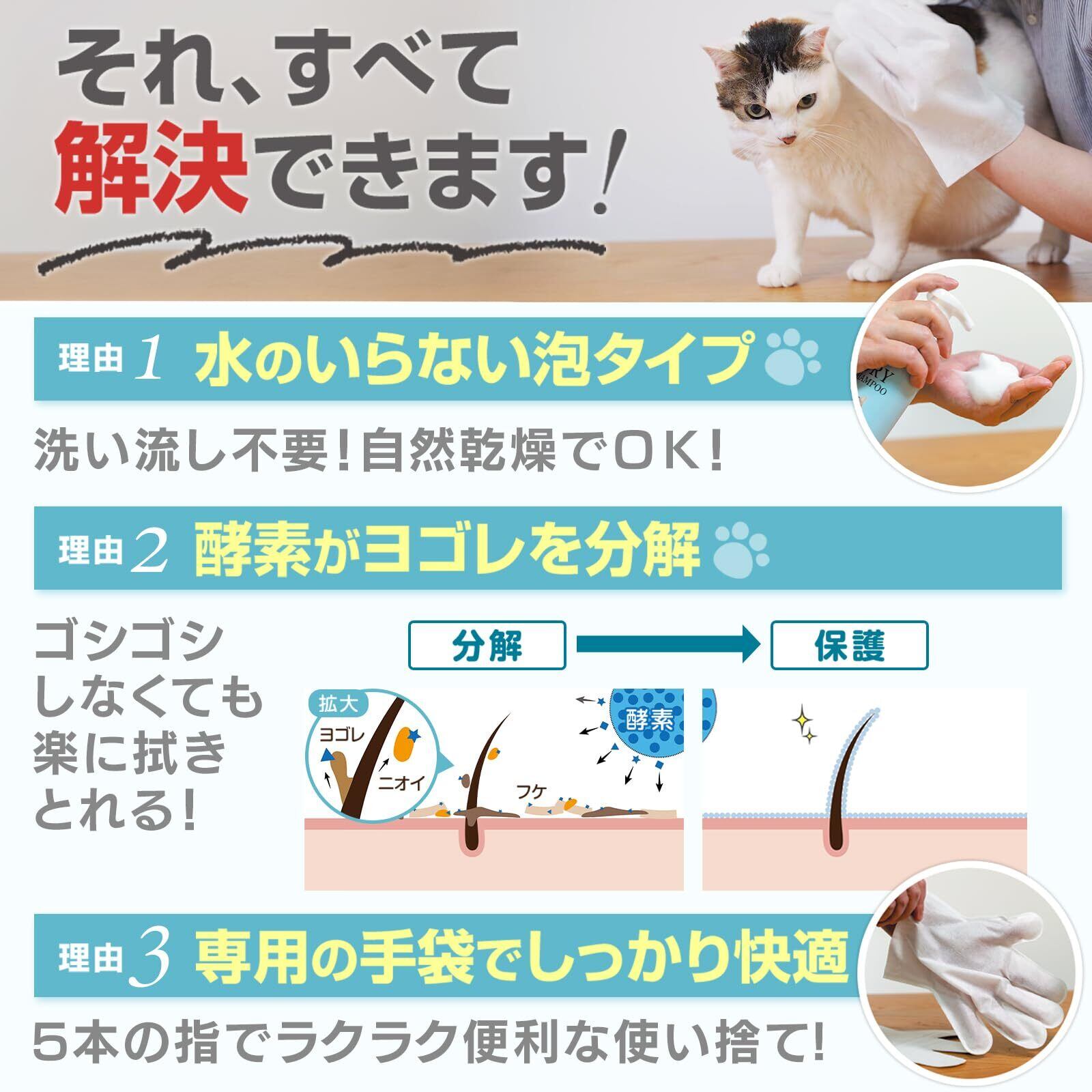 【猫シャンプーを身近に】水が苦手なネコちゃんに負担をかけない、水の要らないシャンプー。ゴシゴシして水で洗い流す通常の猫用シャンプーと違い、酵素の力で泡と手袋でマッサージして拭き取るだけのドライシャンプーです。汎用のシャンプータオルより圧倒的に使いやすい手袋付き。