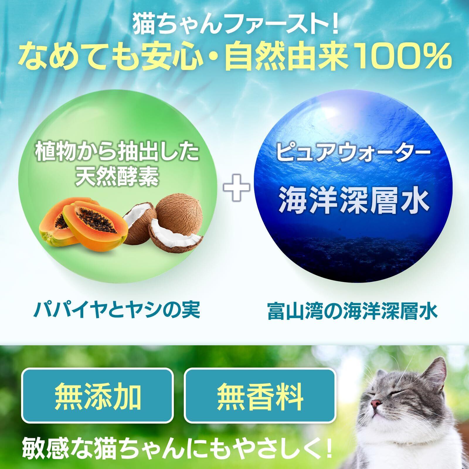 【酵素が汚れを分解】天然酵素と海洋深層水から作られた優しい成分、ネコちゃんがなめても安心です。泡でマッサージすることで被毛から地肌までしっかり浸透。酵素の働きでヨゴレ・ニオイ・フケを分解し、ふき取りやすくします。仕上がりはふんわり・ツヤツヤ。猫ニキビにもおススメです。