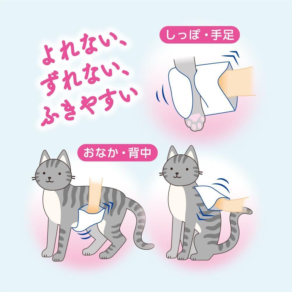 シートがよれにくく、手足やしっぽまで全身をラクにふける。うるおいリッチな厚手シートで汚れや菌、ニオイをすっきりふきとる。ふんわりサラサラ仕上げ。外側と内側の2枚重ねの袋型なので汚れが手にうつりにくい。ペットに安心設計(ノンアルコール、洗浄成分は食品に使われる成分100%)。やさしいアクアフローラルの香り(無香料)。