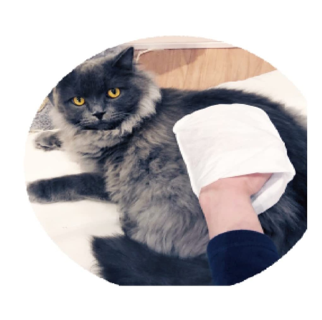 ①袋を開封し、ミトン型シートを端部分より1枚ずつ取り出す。②手にはめて、気になるペットの汚れをやさしくふきとる。