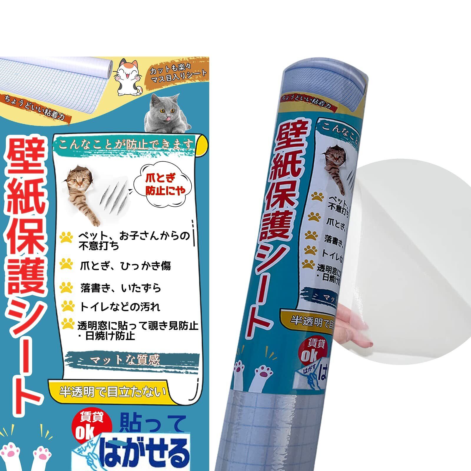 【貼りやすく剥がしやすい】壁保護シートは方眼入りの剥離紙でサイズを測りながら簡単カット。仮止めができるので、シワを伸ばしながら位置を調整でき、貼り直しも可能です。爪研ぎ防止シートはDIYが初めての方にもおすすめ。