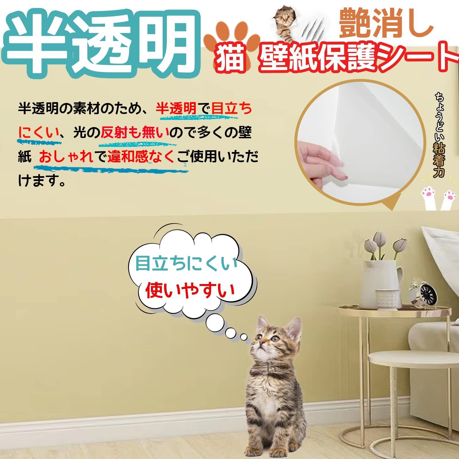 【プロ仕様のしっかり接着】お客様の声から生まれた厚さ0.3mmのしっか猫 壁紙保護 シート。壁紙保護シートに特化した粘着で、ペットの爪や飛びつきからもしっかりガード。必要な時はきれいに剥がせる設計で、賃貸住宅でも壁紙を傷つけずご使用いただけます。