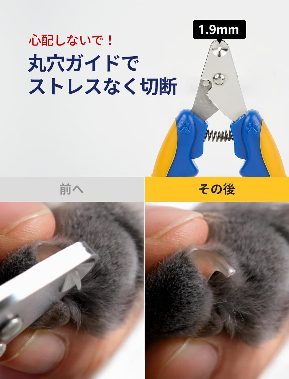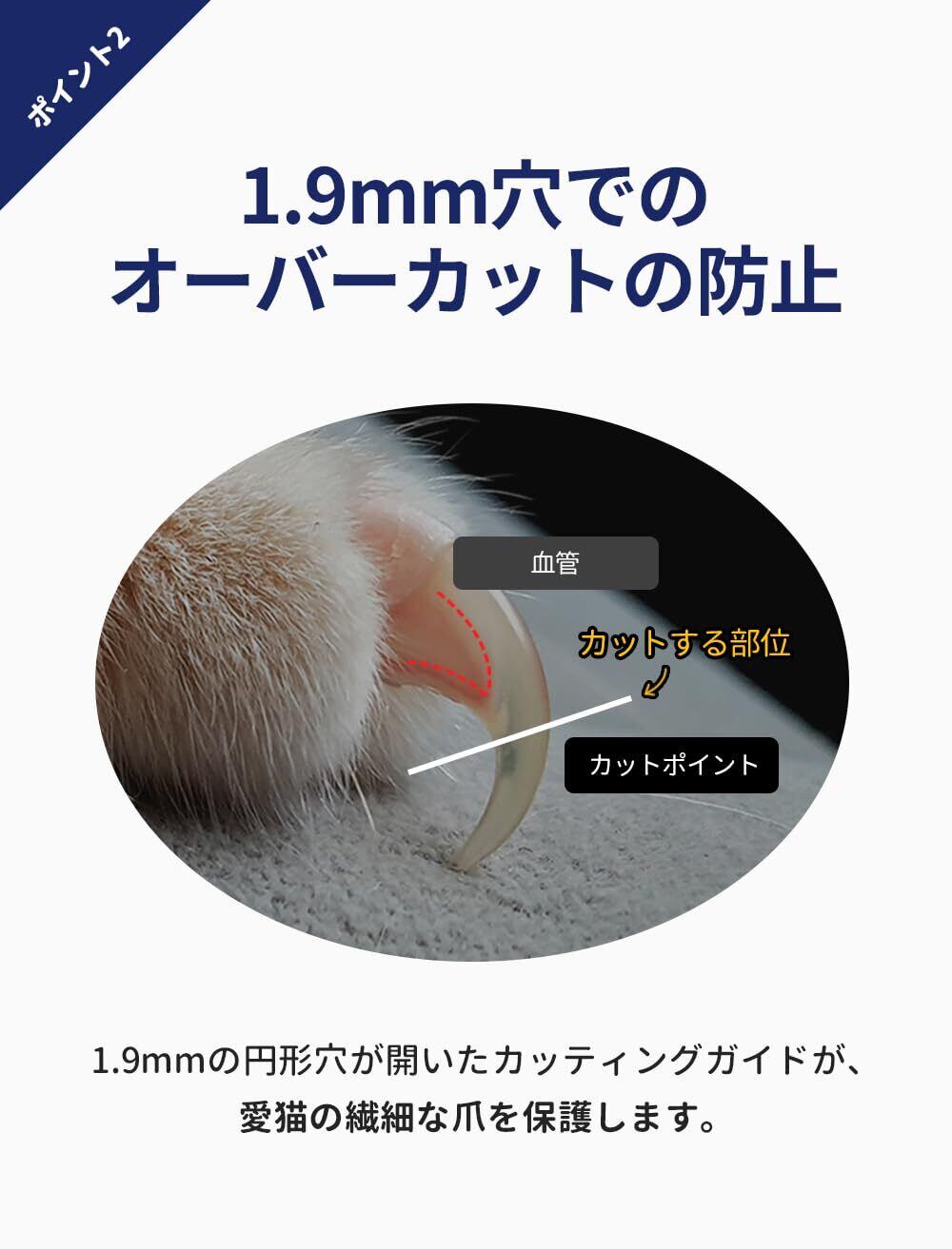 【1.9mmの穴で正確にカット】 猫の爪のお手入れには、正確さが何よりも大切です。ペスルームの爪切りは、ギロチンタイプの1.9mmの穴で、丸い爪にも尖った爪にも対応できるユニークなデザインです。従来のバリカンでは、カットが不正確で、不必要な苦痛を与えてしまうことがよくありました。ペスルームの革新的なデザインなら、爪の尖った部分だけをレーザーで確実にカットし、ペットの快適性を最大限に高めます。爪切りを面倒な作業からシームレスな日課に変えましょう。
