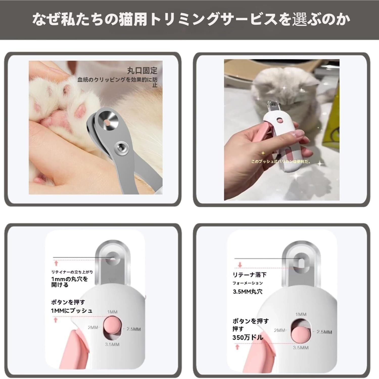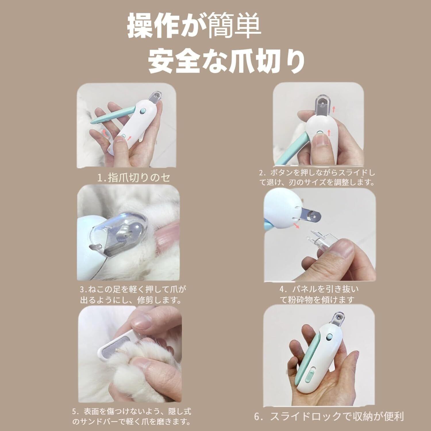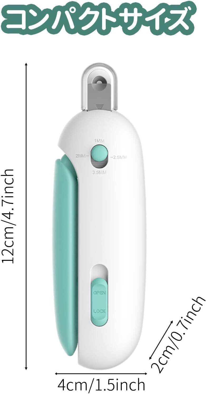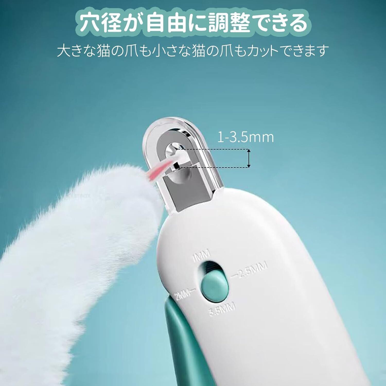爪切り穴は1~3.5 mmまで4段階で調節でき、ペットの爪の直径に合わせて取り付けることができます。子猫から大人の猫、小型犬から大型犬まで使える爪切りです。ペットの爪に密着し、爪が深くなるのを防ぎます。初心者はもちろん、どの飼い主にも使える全年齢向けの爪切りです。爪切りには爪やすりが隠れています。爪を切った後、軽く爪を研ぎます。