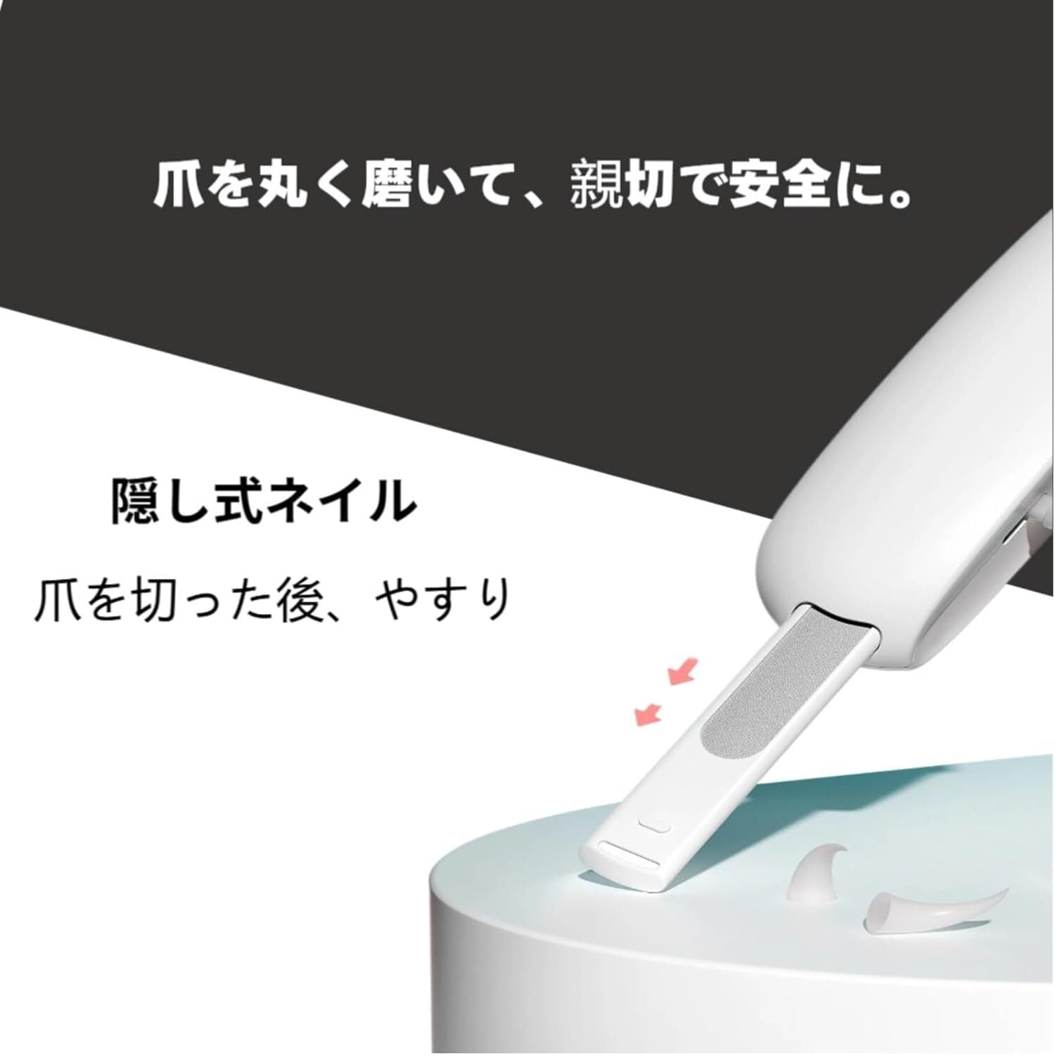 切った爪が飛び散らないように設計されたカバーが付いており、切った後の掃除が簡単です。これにより、周囲を清潔に保つことができます。飛び散り防止カバーは透明で、切る際の視界を妨げません。