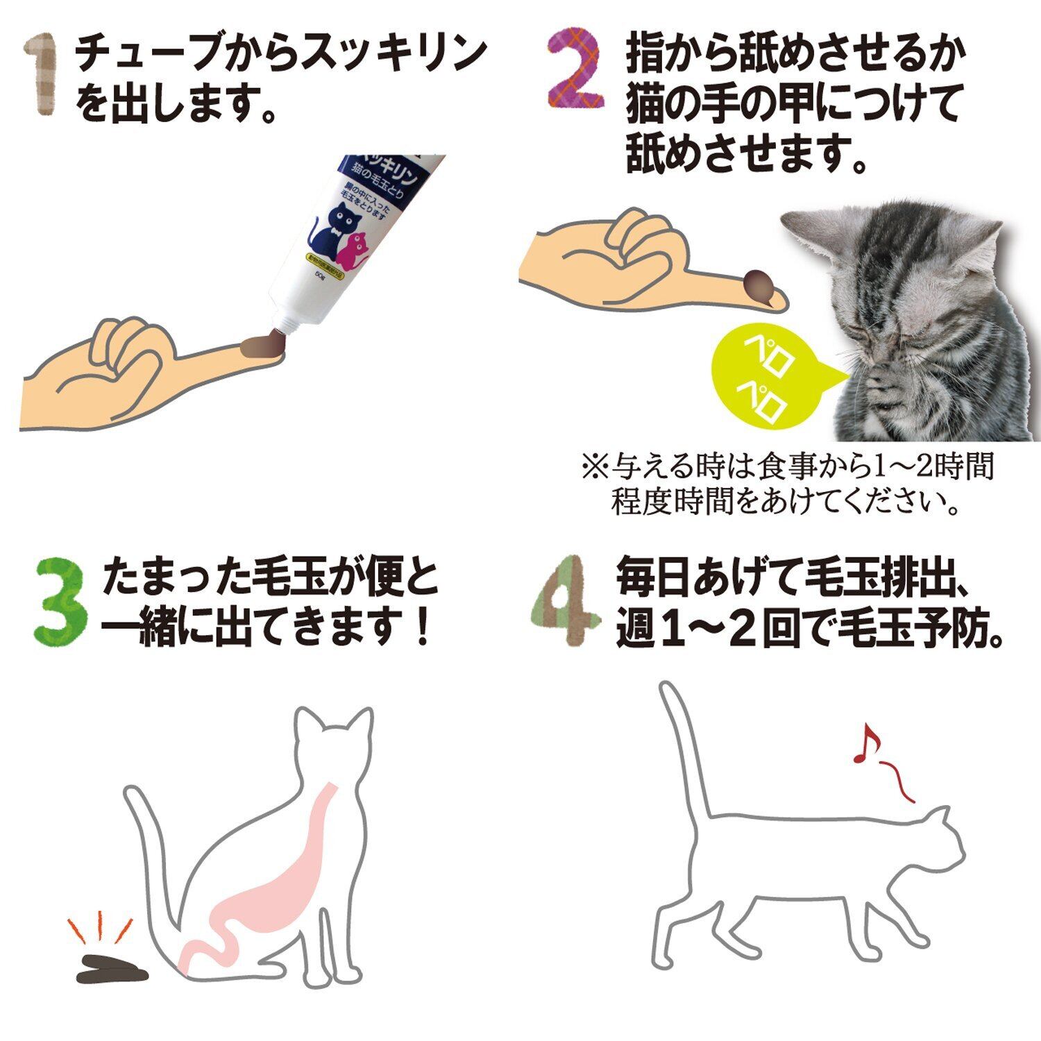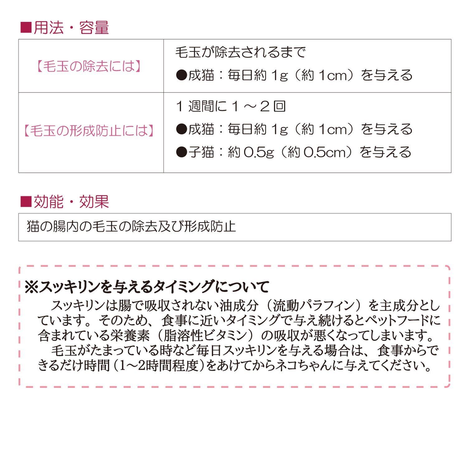 猫ちゃんは毛づくろいをすることで毛が腸に溜まります。溜まった毛玉は吐き気・便秘・咳などの原因となる場合があります。「スッキリン」はペースト状で与えやすく、お腹に溜まった毛玉をふん便と一緒にやさしくスッキリ取り除き、猫ちゃんの快適な毎日を応援します。