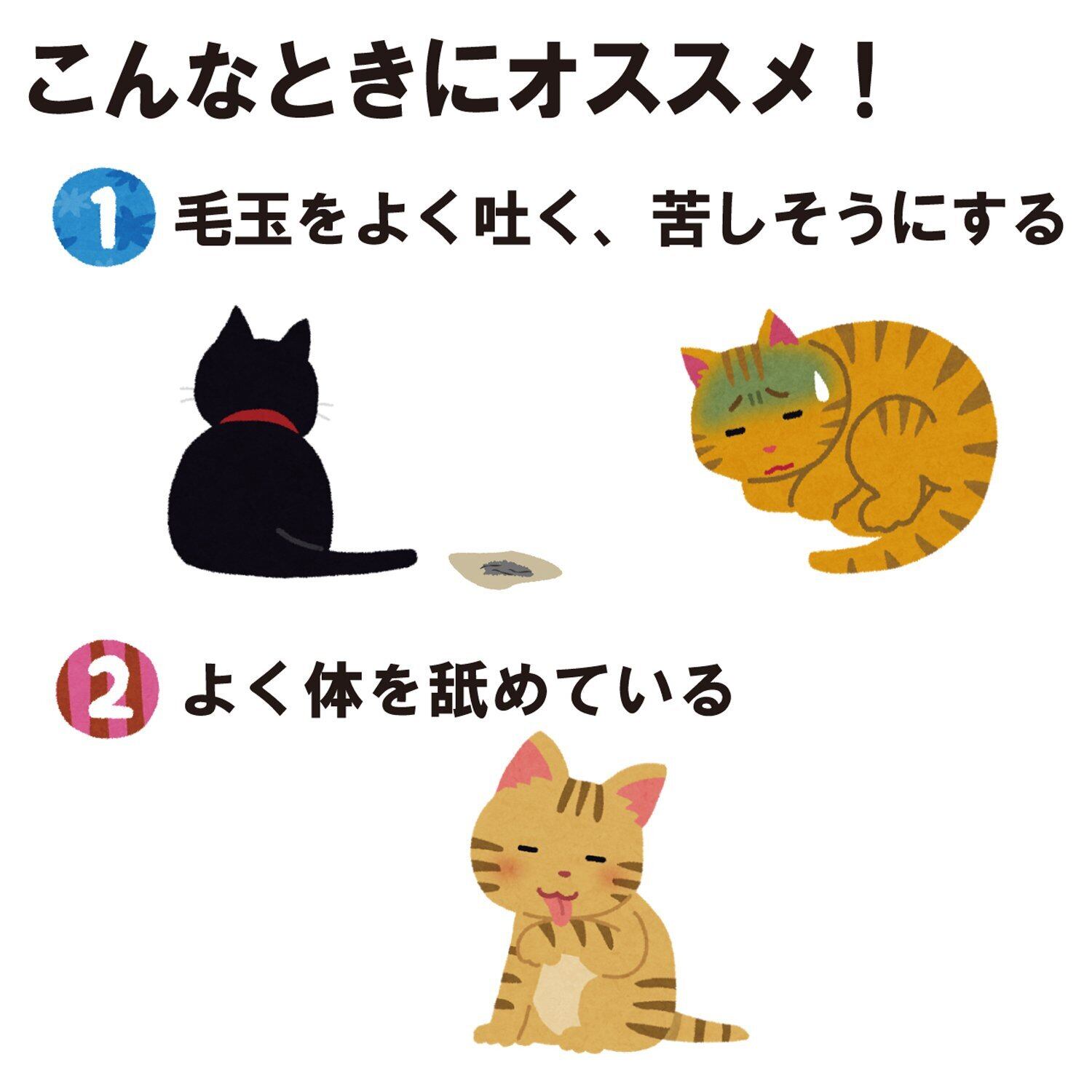 指で与えるか、愛猫がなめる部分などにつけて与えて下さい。 (毛玉除去には)毛玉が除去されるまで ・成猫:毎日約1g(約1cm)を与える (毛玉の形成防止には)1週間に1~2回 ・成猫:約1g(約1cm)を与える ・子猫:約0.5g(約0.5cm)を与える
