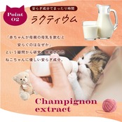 【安らぎ成分でまったり時間】赤ちゃんが母親の母乳を飲むと安らぐのはねぜか。という疑問から研究、開発されたねこちゃんに優しい安らぎ成分ラクティウムを使用