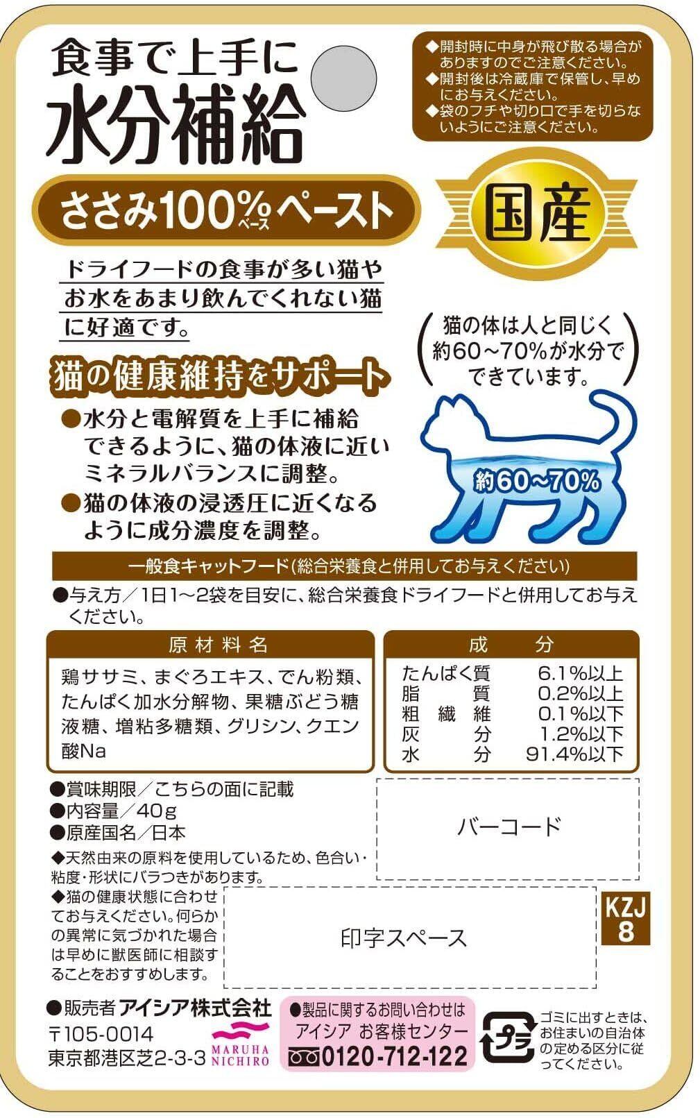 【原材料】鶏ササミ、まぐろエキス、でん粉類、たんぱく加水分解物、果糖ぶどう糖液糖、増粘多糖類、グリシン、クエン酸Na 【成分】たんぱく質6.1%以上、脂質0.2%以上、粗繊維0.1%以下、灰分1.2%以下、水分91.4%以下 【エネルギー】14kcal/袋