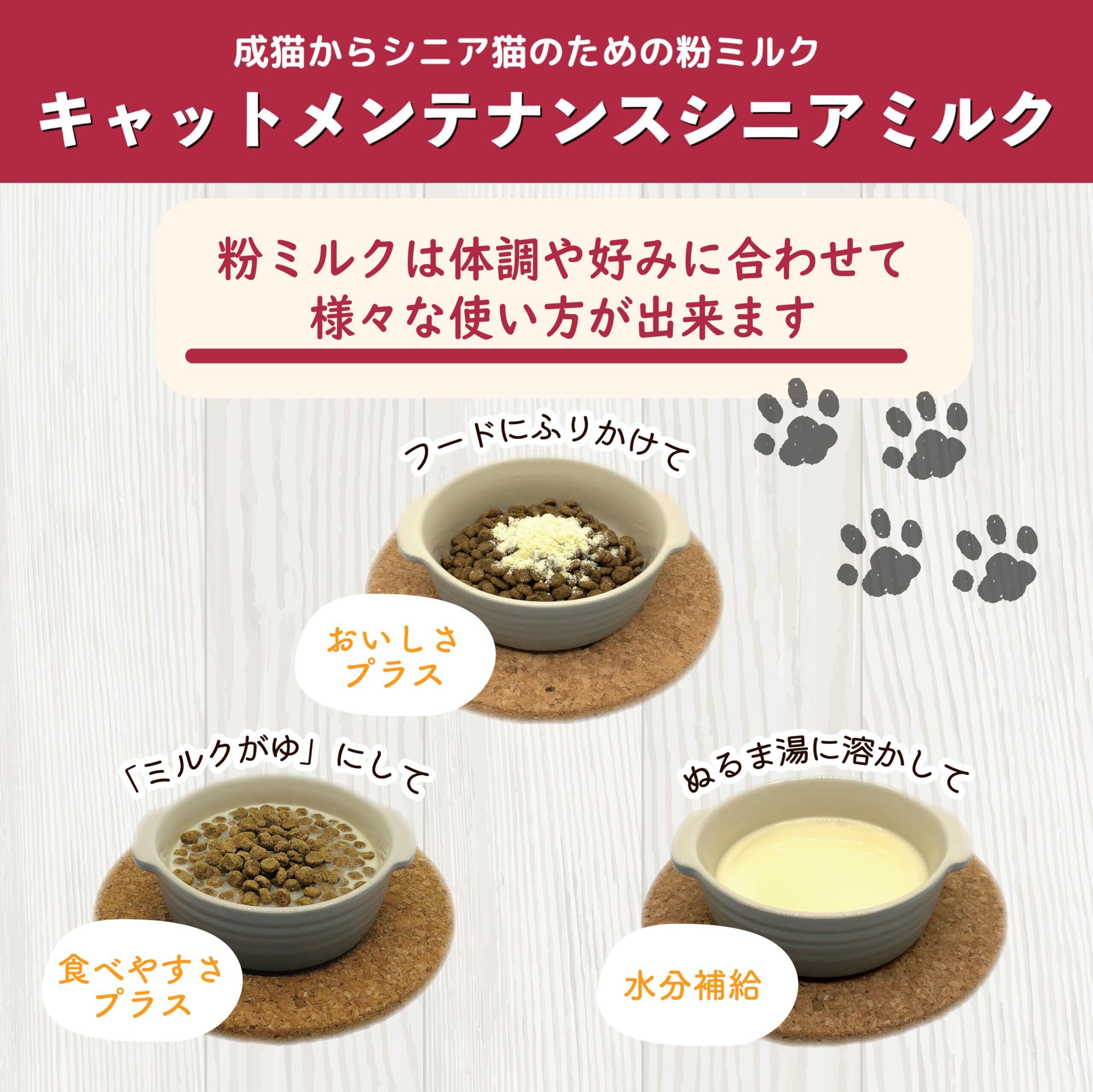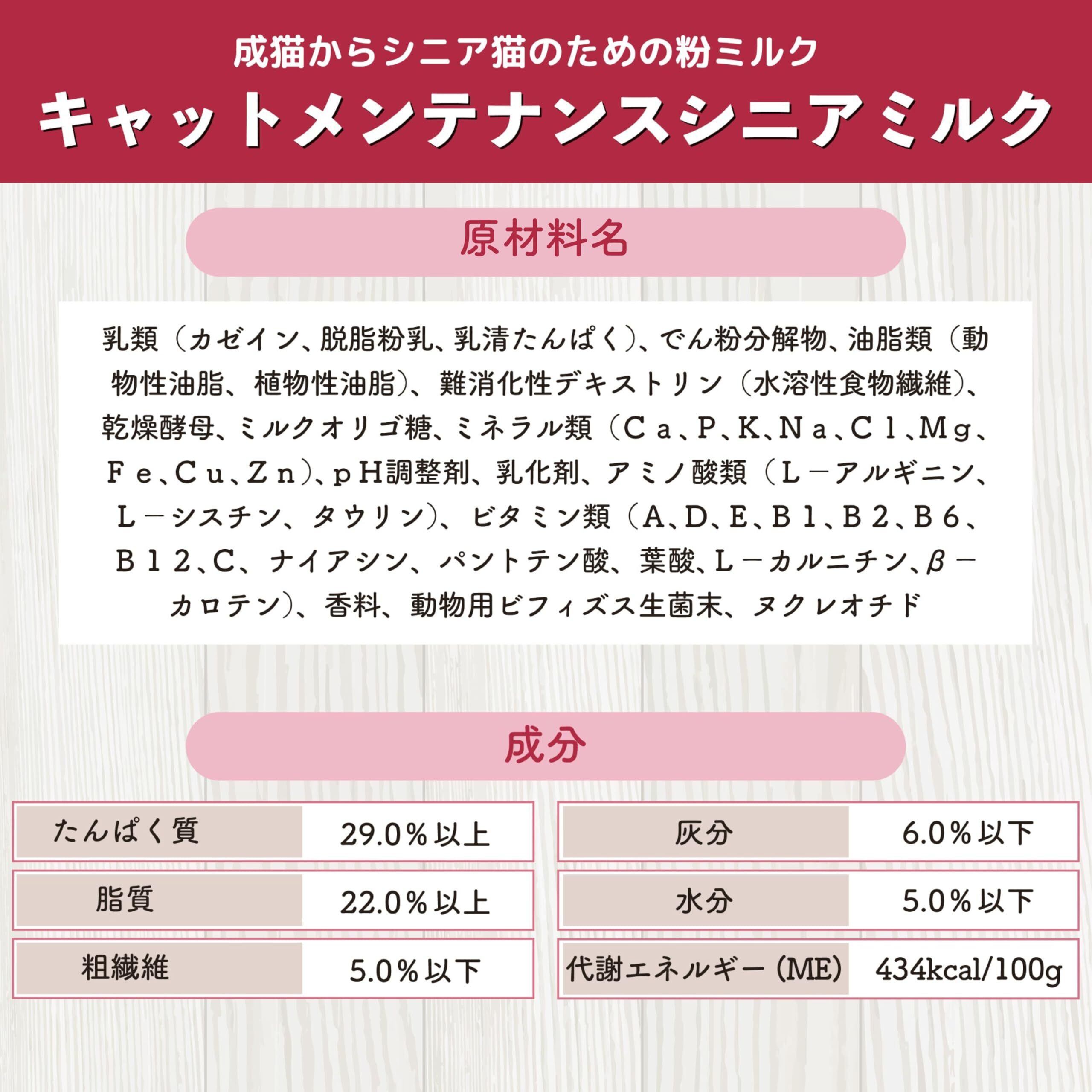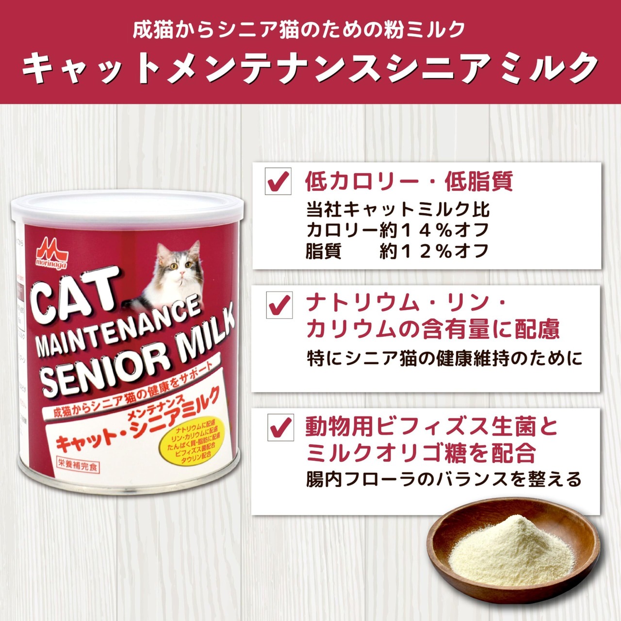 シニア猫に最適な低リン、低ナトリウム、テイカリウム、低脂肪、低たんぱくの心臓・腎臓に配慮したオイシイミルクです。