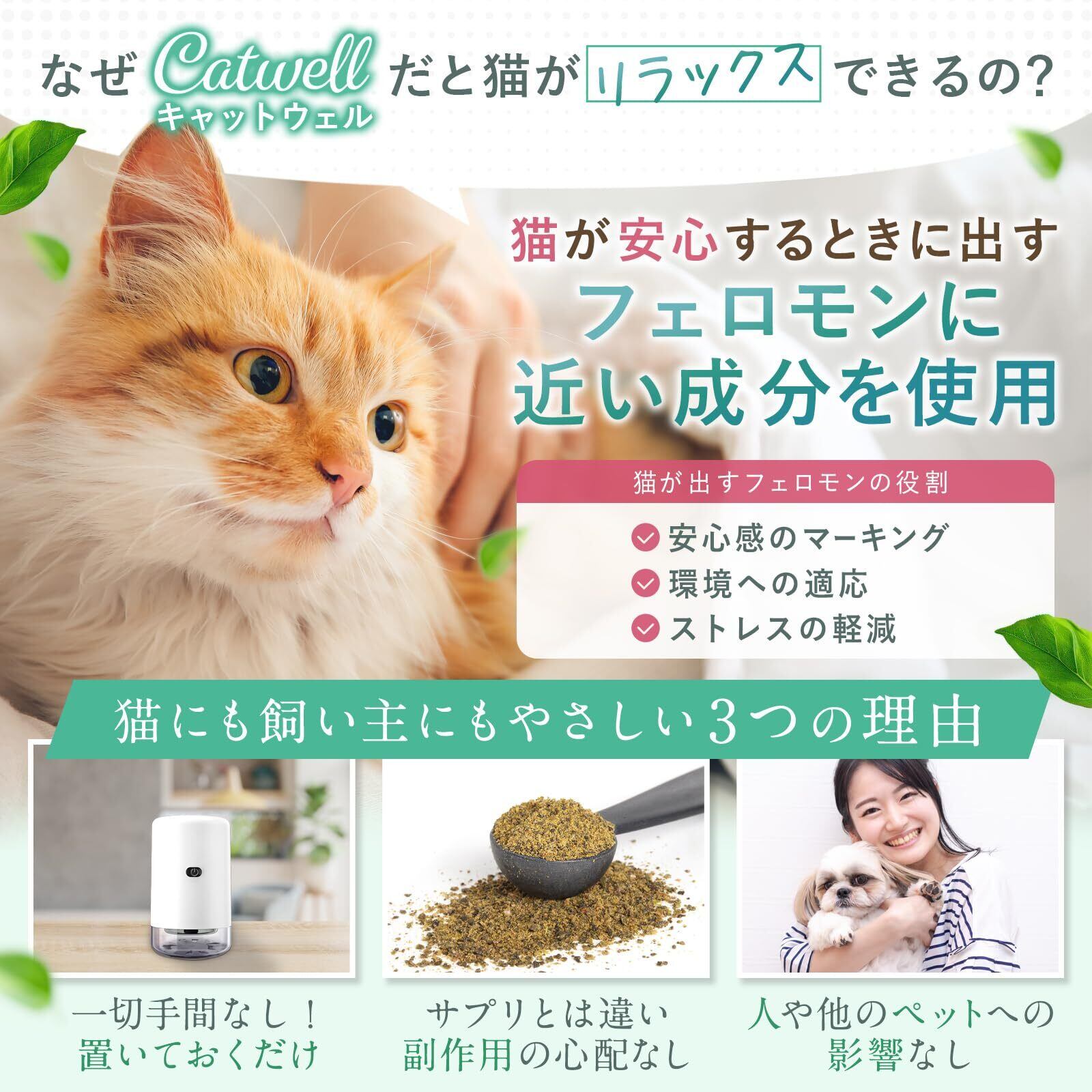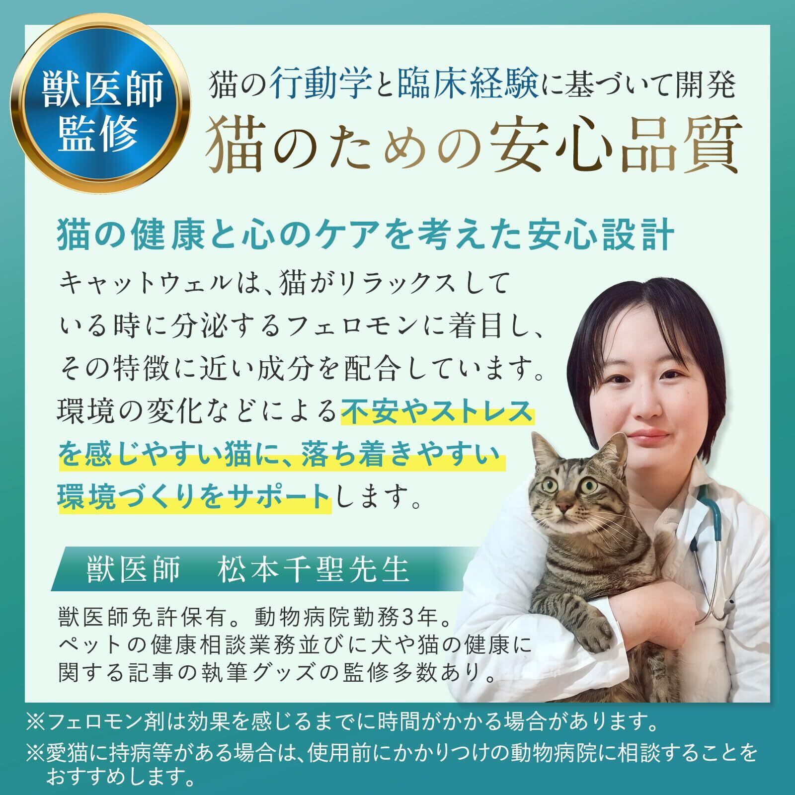 キャットウェルは獣医の監修のもとで開発された製品で、猫の自然なフェイシャルフェロモンを模倣し、猫がストレスから引き起こす行動を減らすのに役立ちます。