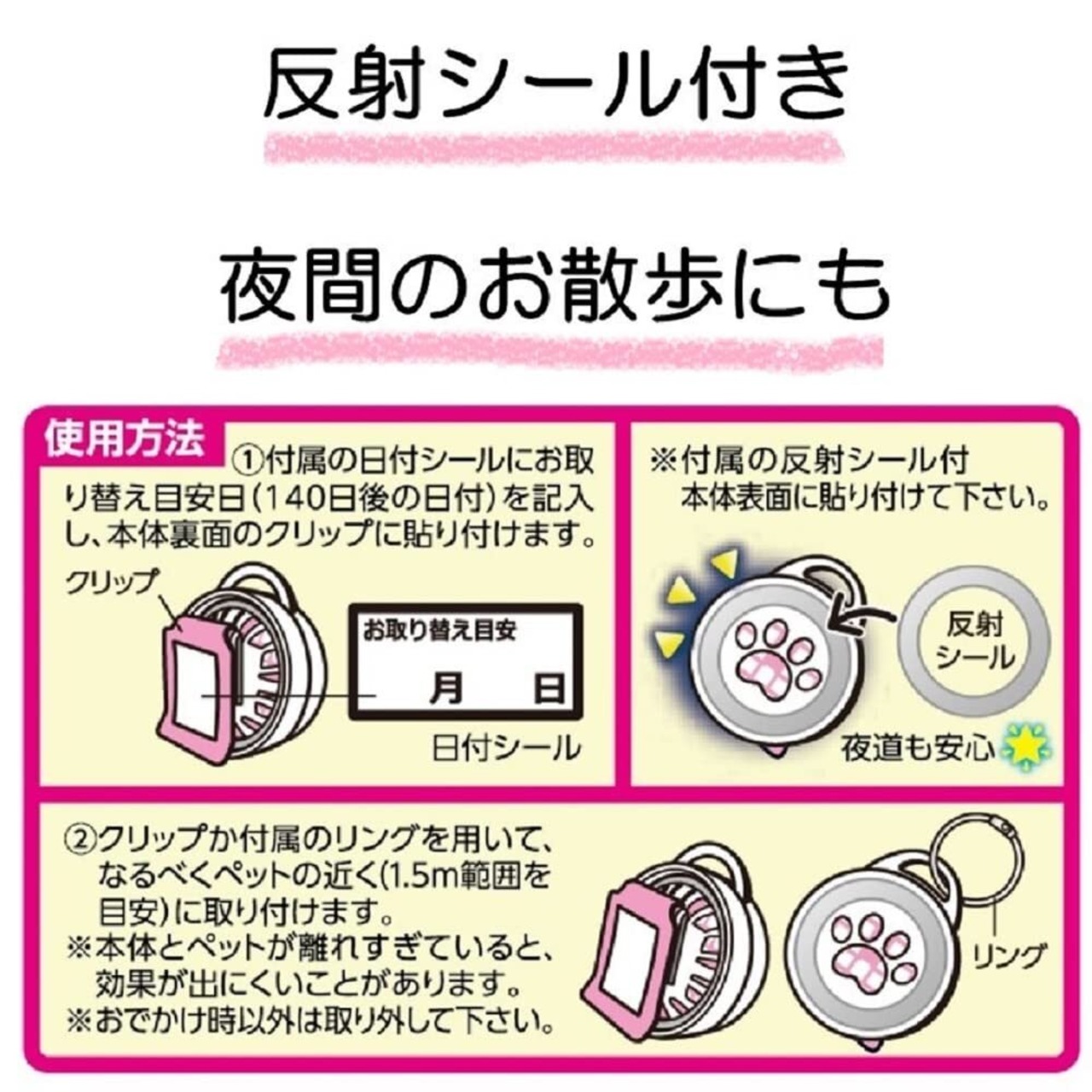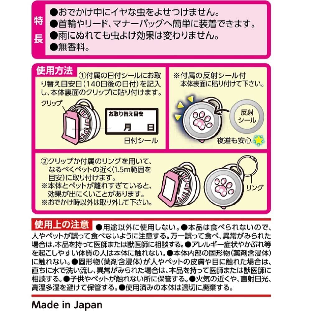 ● おでかけ中にイヤな虫をよせつけない。 ● 首輪やリードなどへ簡単に装着できる。 ● 雨にぬれても変らない虫よけ効果。 ● 夜のお散歩も安心な反射シール付き。