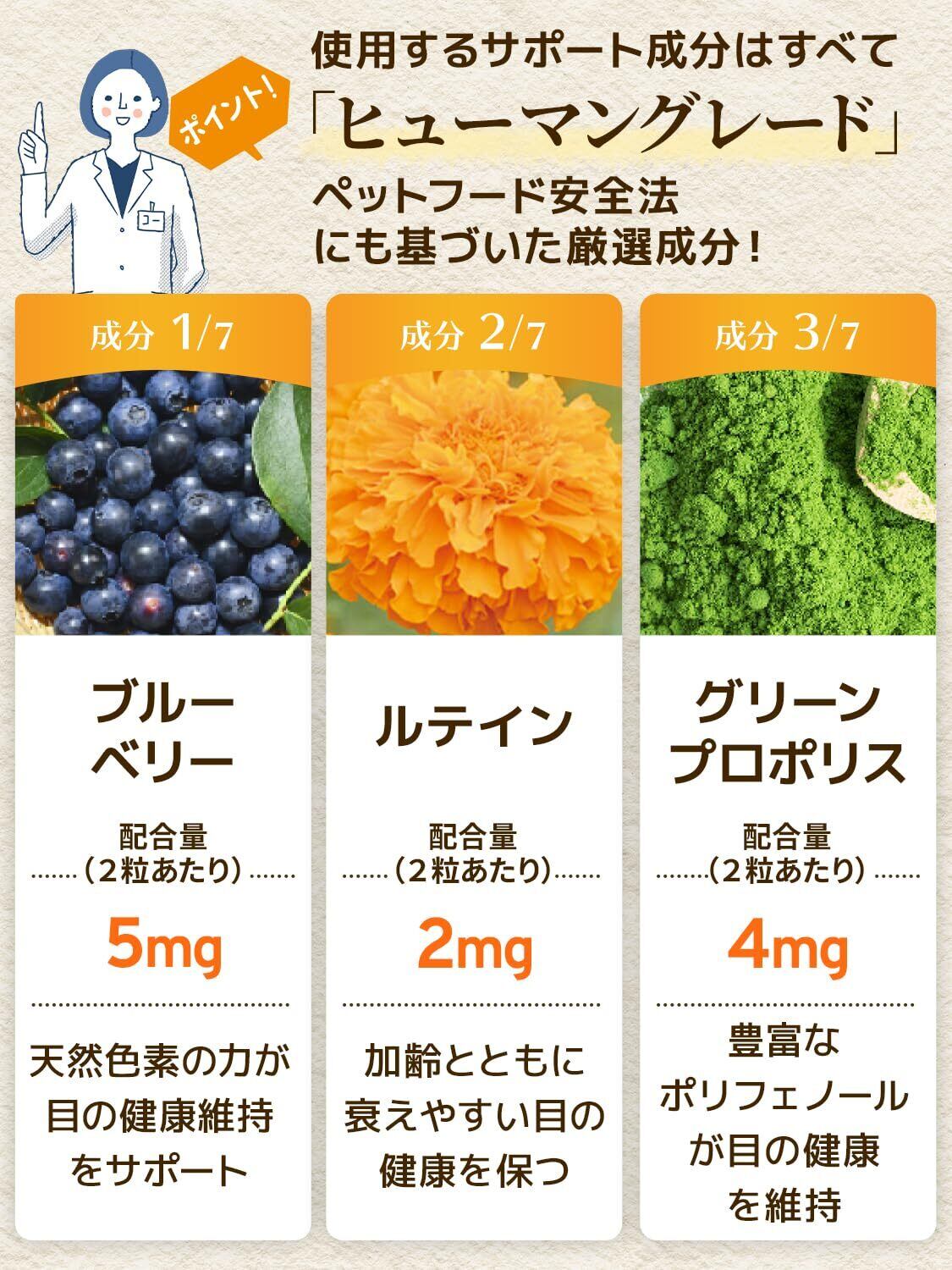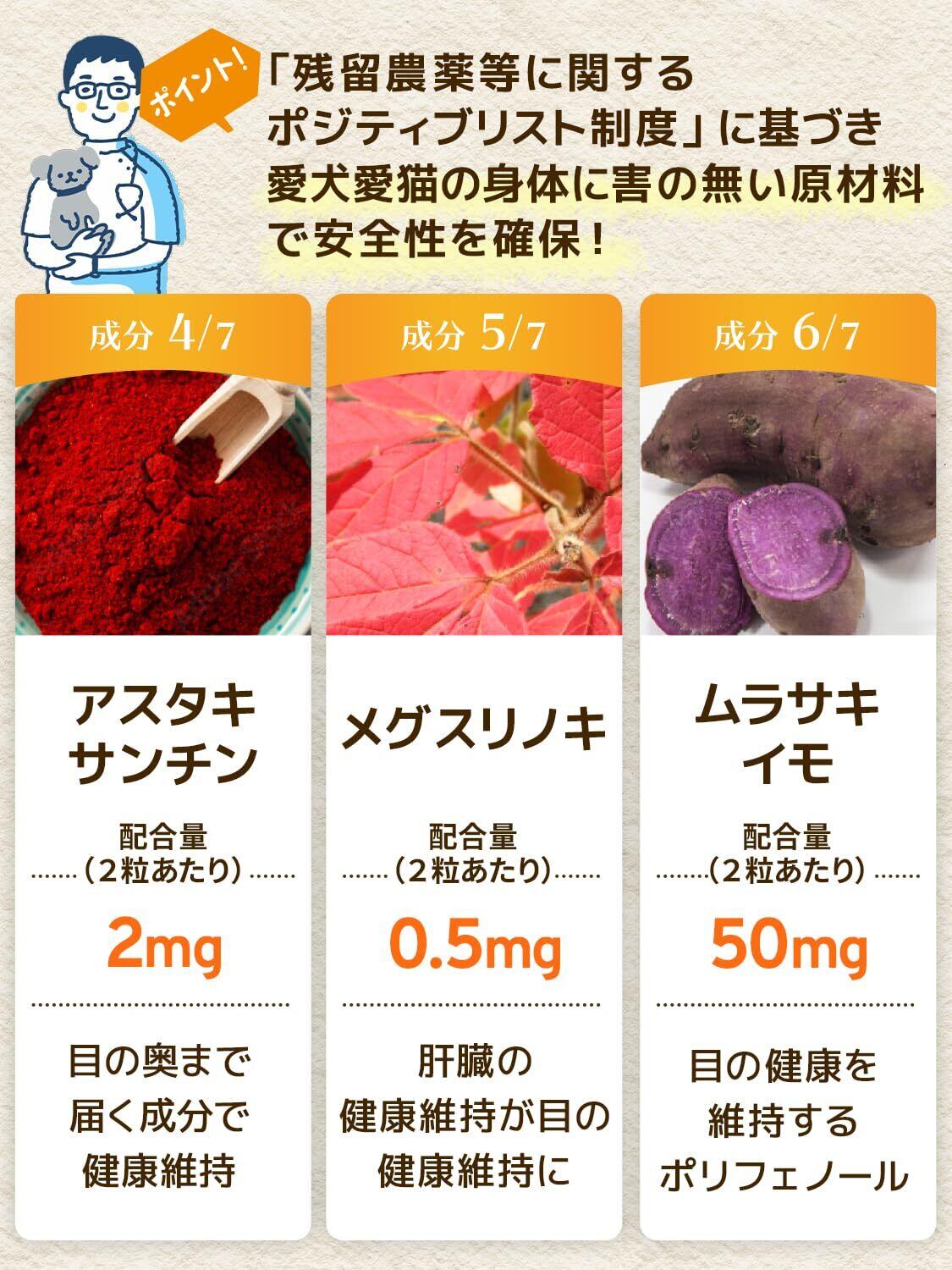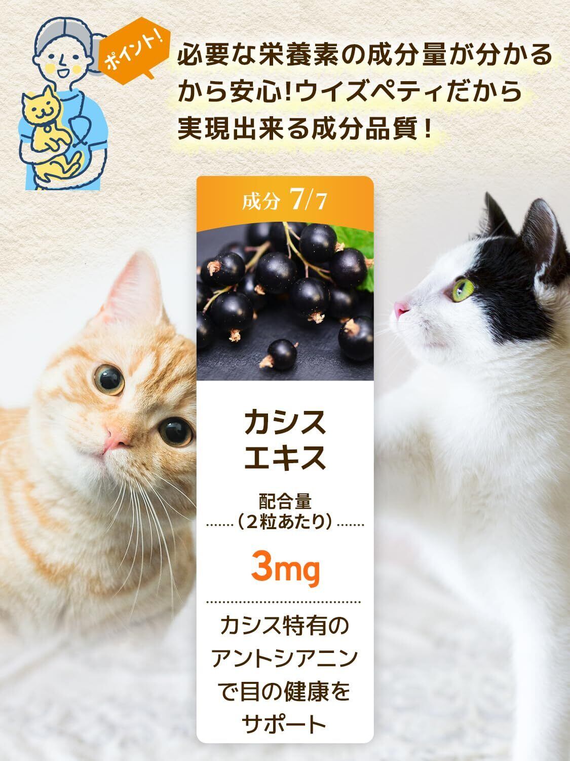 【成分配合量の表示】ウィズペティは原材料の表示だけではなく主成分の成分配合量も表示しております。大切な愛猫が口にするペットサプリメントを正しくご理解いただき長くご愛用頂く事が大切だと考えます。[猫の目のサプリ:毎日愛眼 2粒あたりの主成分配合量/ブルーベリーエキス末 5mg、ルテイン(マリーゴールド) 2mg、プロポリスエキス末 4mg、ヘマトコッカス藻色素(アスタキサンチン) 2mg、メグスリノキエキス末 0.5mg、紫イモ末 50mg、カシス抽出物3mg]