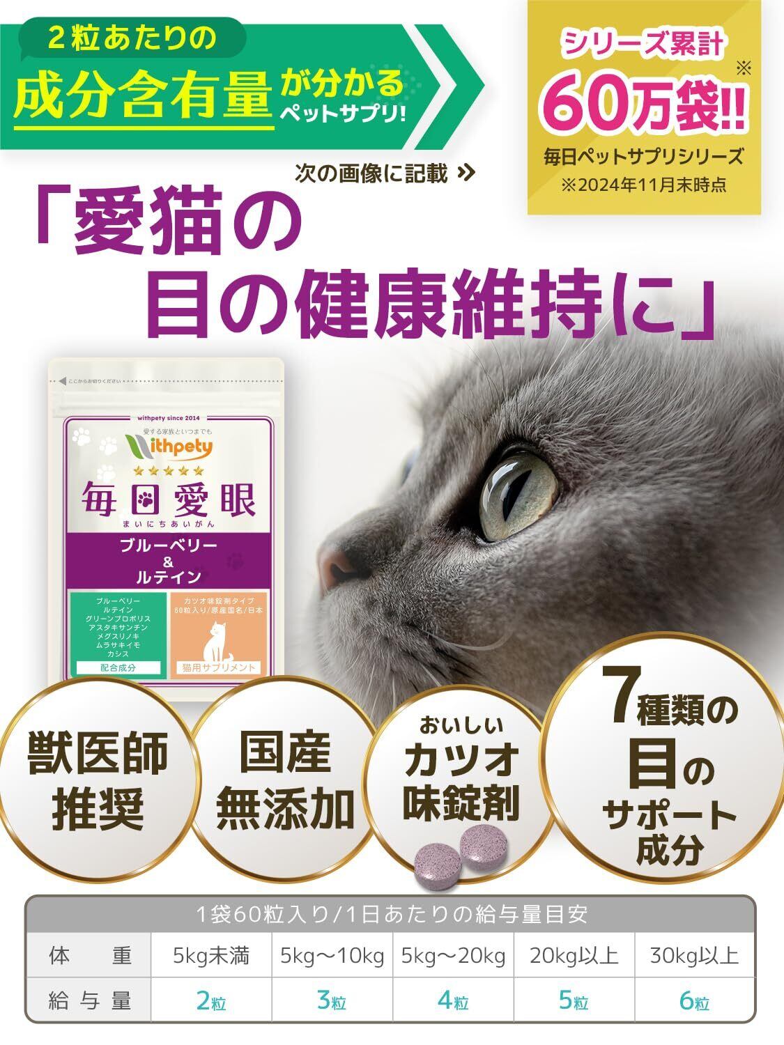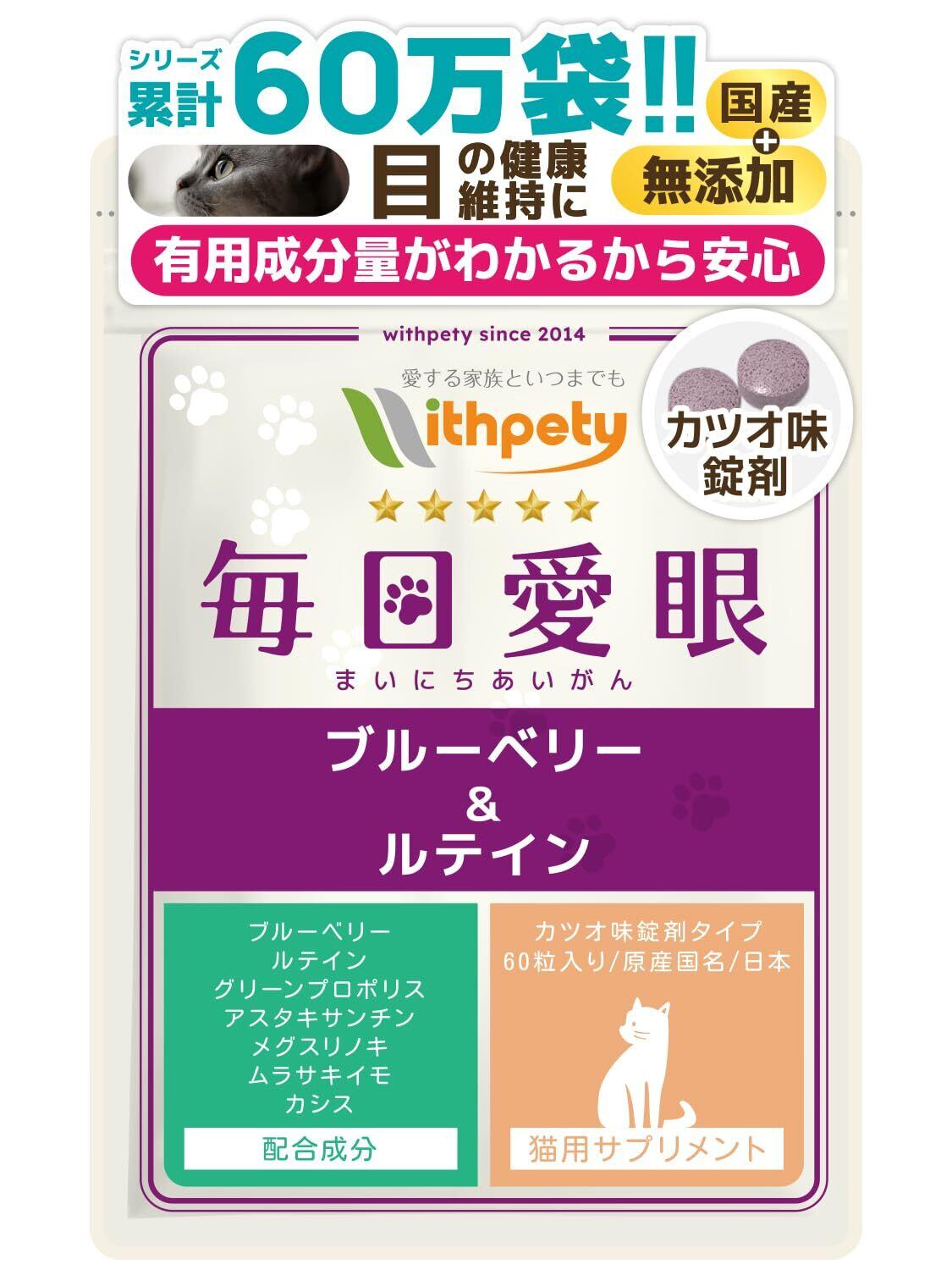 毎日愛眼 猫 目 サプリ 国産 無添加 成分量明記【7成分配】 ブルーベリー ルテイン グリーンプロポリス メグスリノキ アスタキサンチン カシス 紫イモ<カツオ味錠剤 猫用 サプリメント 1袋60粒入>[ウィズペティ公式]