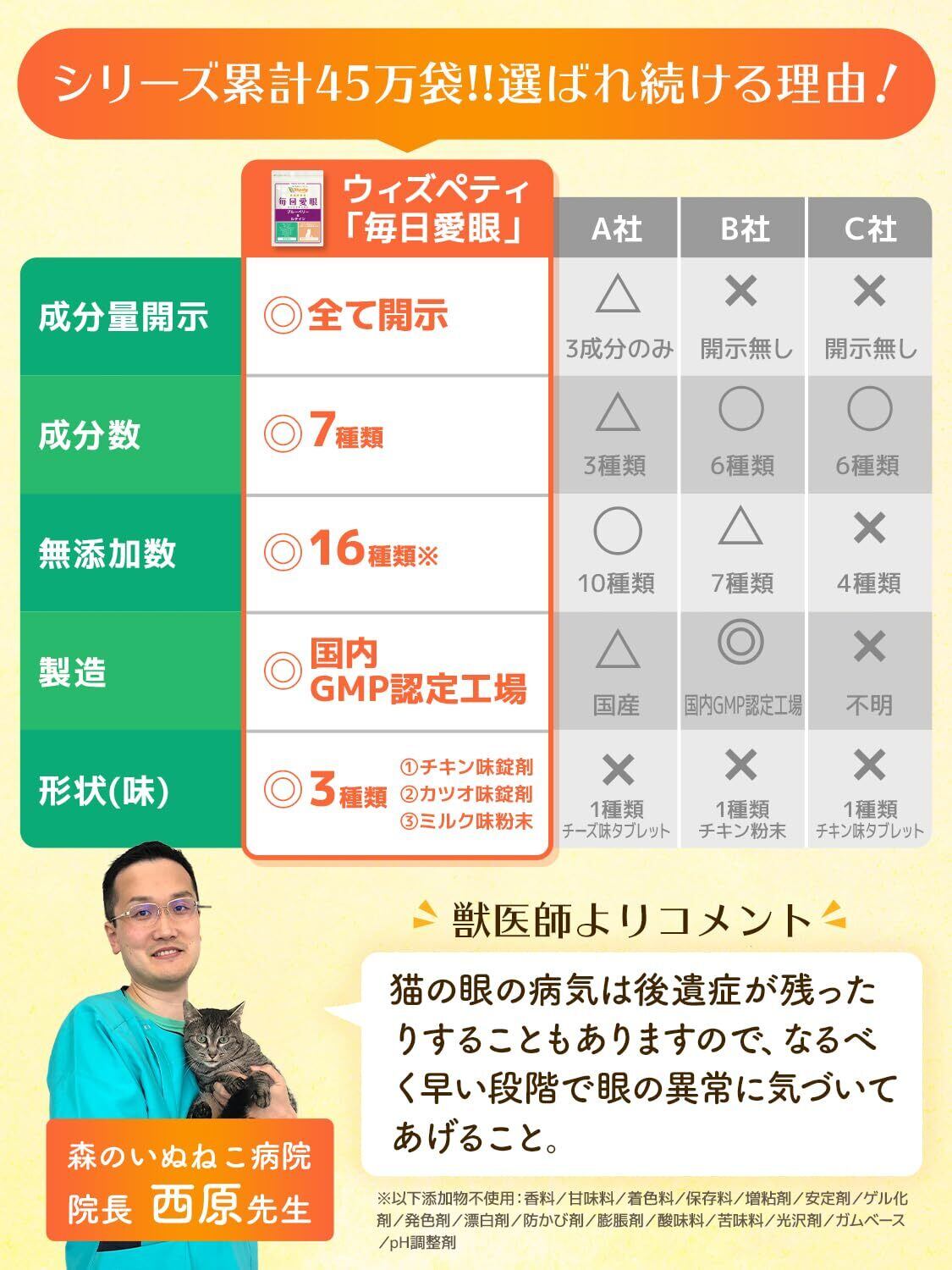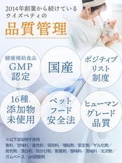 【安心のヒューマングレード/4大添加物未使用の国産ペットサプリ】ウィズペティのペットサプリメントは人間のサプリメントと同じGMP国内工場で製造しています。ペットフード安全法、残留農薬のポジティブリストに基づき、香料・着色料・保存料・化学調味料を使用せずに製造しています。サプリメントは全猫種が食べやすいカツオ味の錠剤タイプです。(粒の直径8mm~10mm/商品によってサイズが異なります)
