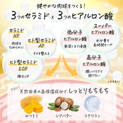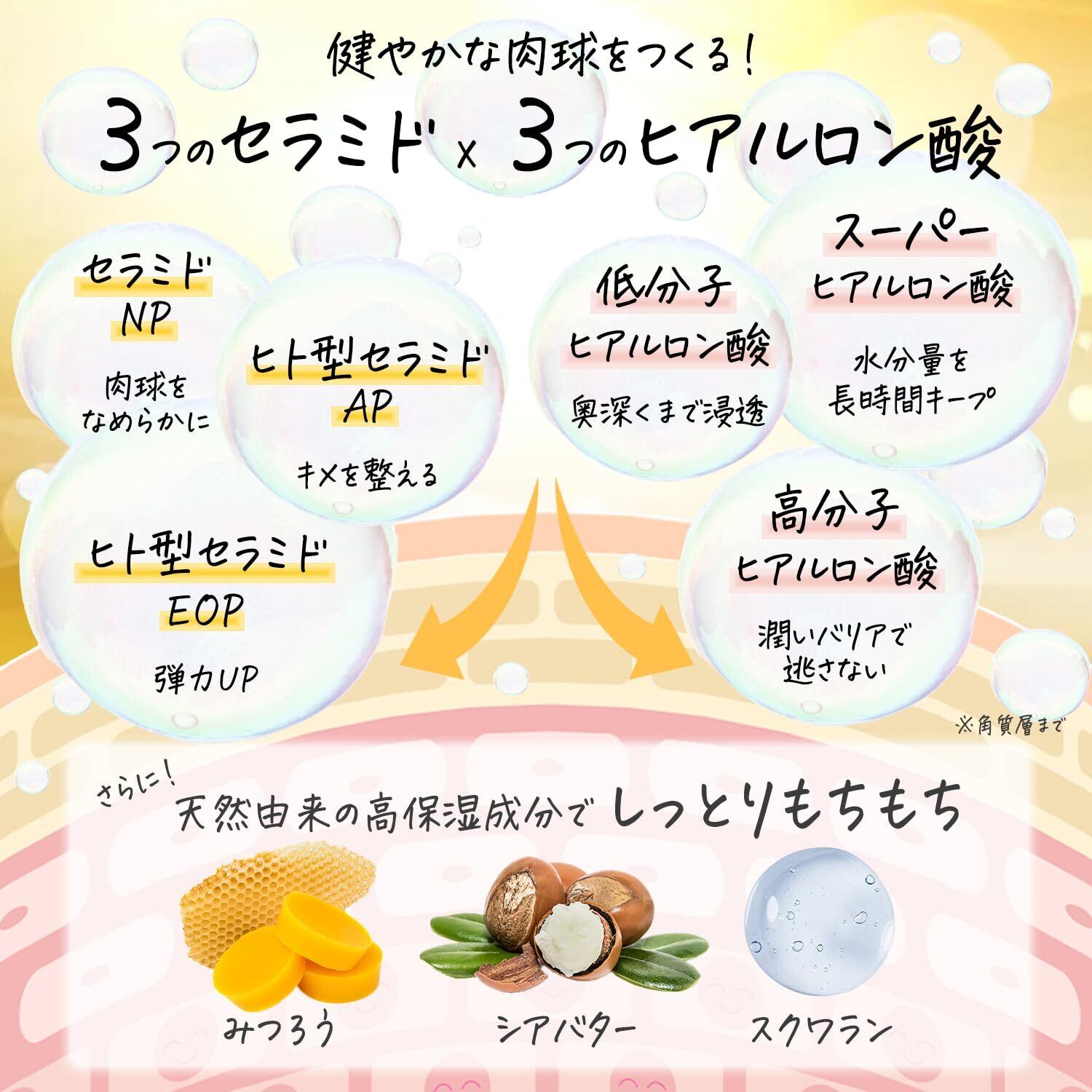 ヒアルロン酸3種、セラミド3種を配合したトップクラスの保湿力。さらに蜜蝋、シアバター、スクワランの保湿サポート成分をバランスよく配合しています。
