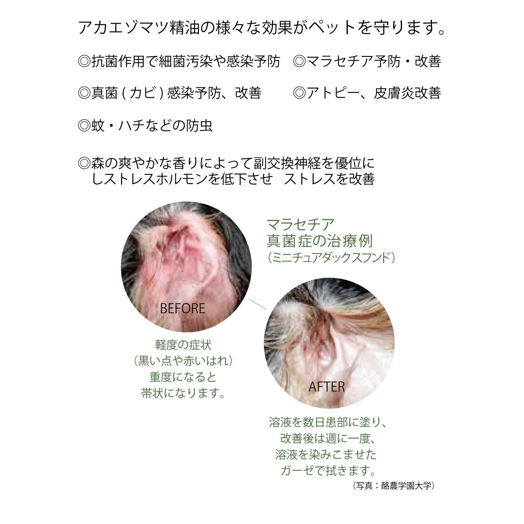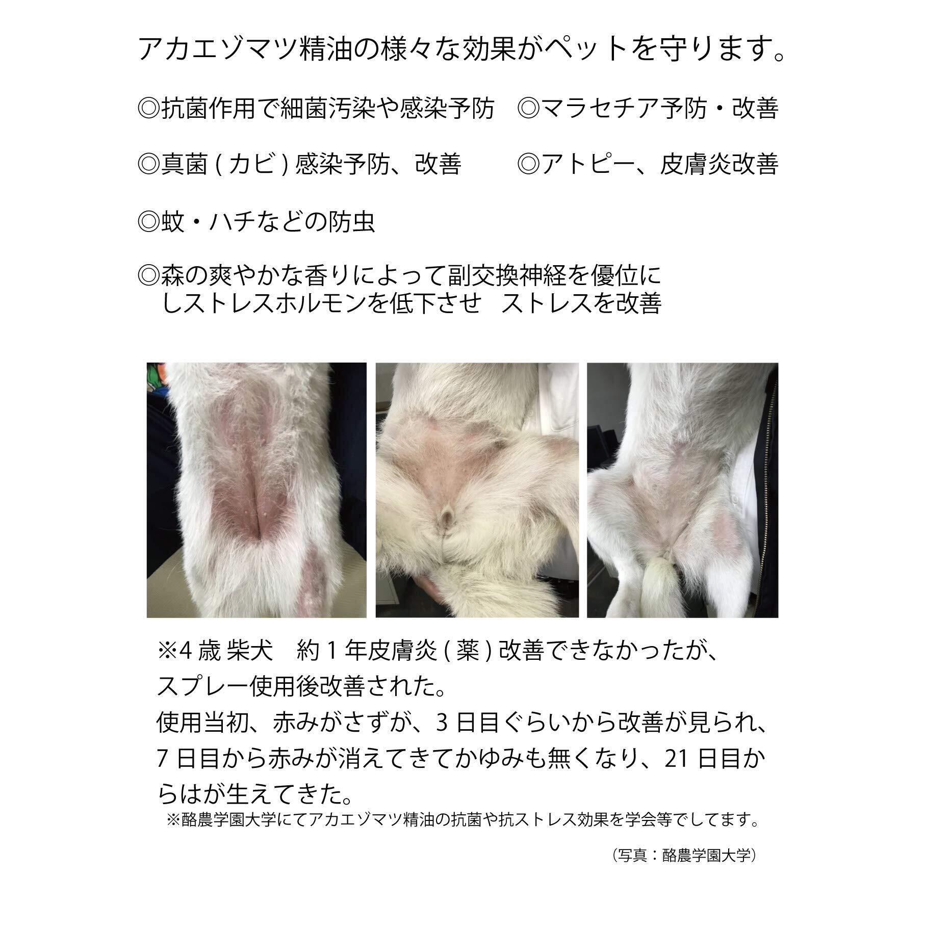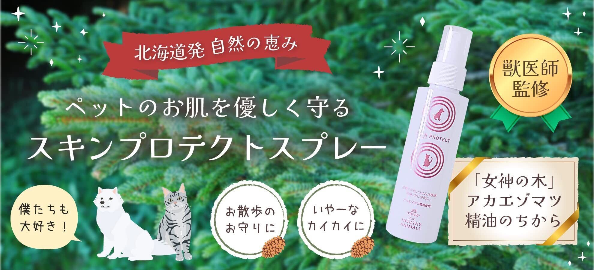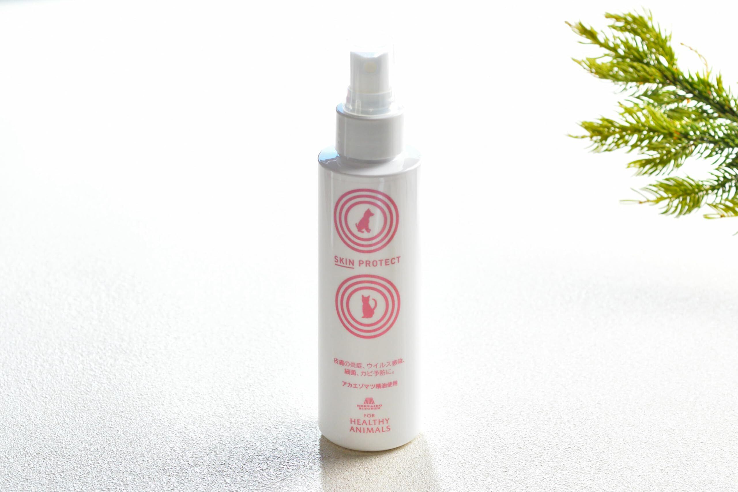 北海道の針葉樹「赤エゾマツ」のオーガニックスプレー。ペットの肌を優しく守るスプレーを天然素材で北の大地よりお届け スキンプロテクトスプレー(SKIN PROTECT)120ml (マラセチア菌、アトピー皮膚炎等の予防、改善)人やペットの皮膚に対して炎症の予防や改善のほか、 細菌やカビの感染、防虫によるウイルス感染も防ぎます。 さらにアカエゾマツ精油の爽やかな香りで、消臭やリラックス効果も高いスプレーです。【赤エゾマツとは】北海道東部の針葉樹林に多く、 アイヌの人々に「女神の木」と呼ばれています。 香りがとても良く、抽出した精油には 「皮膚の炎症改善、抗菌、リラックス作用」など数多くの効果が認められています。 酪農学園大学の獣医監修との研究でできたスプレー アカエゾマツ精油の抗菌や抗ストレス効果が酪農大学の学会等で発表されています。◎抗菌作用で細菌汚染や感染を予防します。 ◎快い香りによって副交感神経を優位にし、ストレスホルモンを低下させ、ストレスを改善します。 ◎抗真菌(抗マラセチア、抗カンジタ等)を活性化し、真菌(カビ)感染を予防します。 ◎アトピー、皮膚炎予防、改善 ◎抗MRSAによって耐性菌の感染を予防します。 ◎蚊・ハチの防虫 内容量:120ml