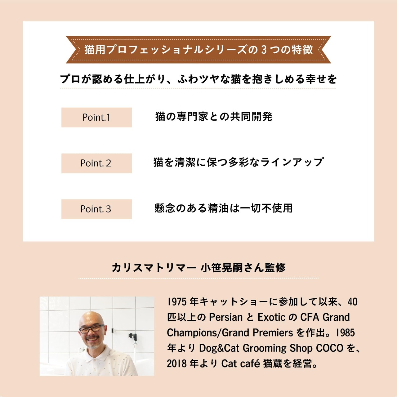 【A.P.D.C.ブランドコンセプト】日常的に使うものだから。より安心・安全なケアアイテムで、愛猫とコミュニケーションを深めてもらいたい。猫の身体に直接触れコンディションを飼い主自らが感じてもらいたい。そんな想いからうまれました。