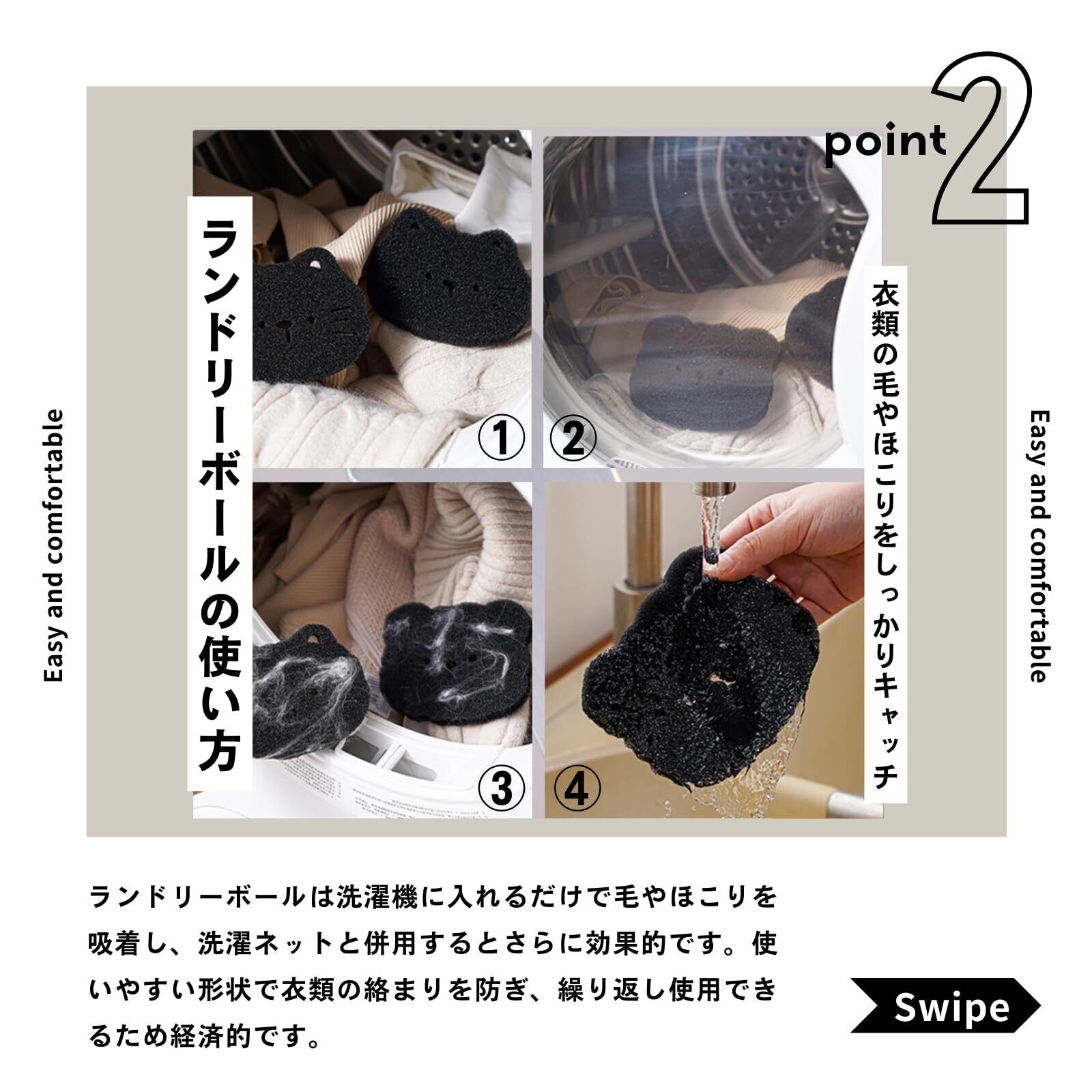 【ランドリーボールの使い方】 ランドリーボールは洗濯機に入れるだけで毛やほこりを吸着し、洗濯ネットと併用するとさらに効果的です。使いやすい形状で衣類の絡まりを防ぎ、繰り返し使用できるため経済的です。デザイン性もあるので、洗濯時に目に入る小物としても楽しめます。