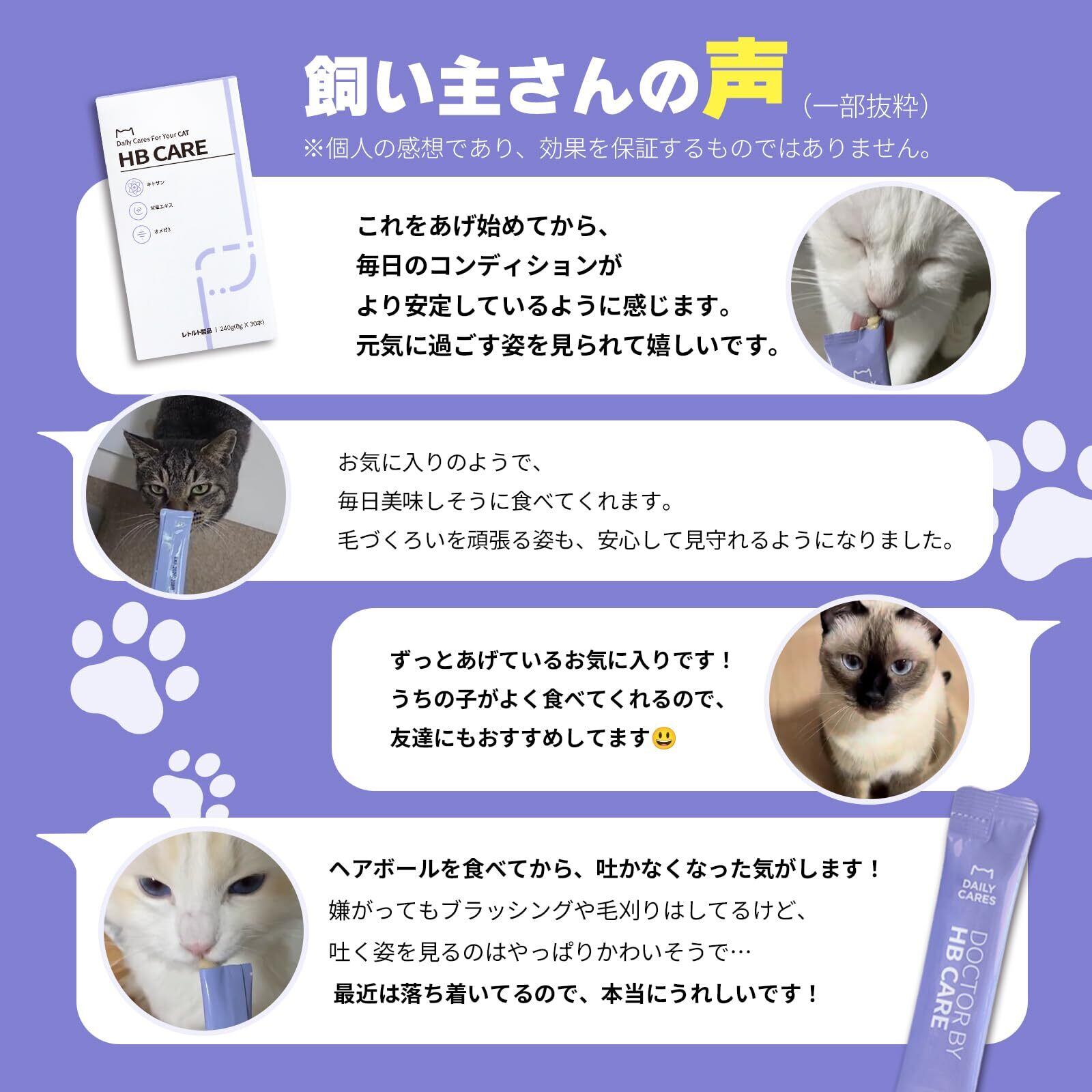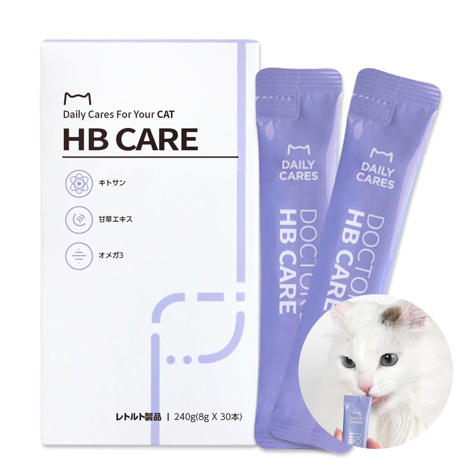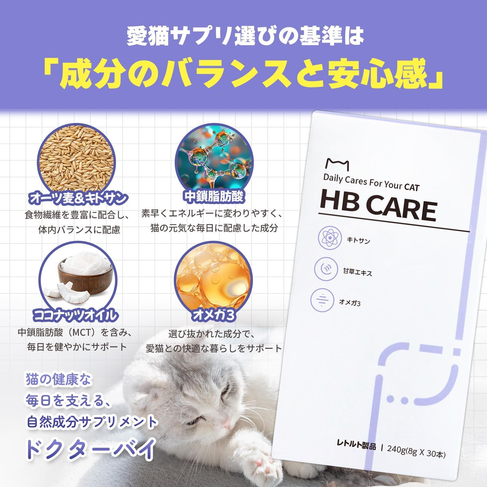 「猫のための栄養ソリューションです!」 【ドクターバイ HB CAREの特徴】 ステップ1:オーツ麦食物繊維、キトサン ステップ2:甘草エキス、キャベツ、山芋 ステップ3:オメガ3、ニンジン B.全ての原材料がヒューマングレード ・着色料不使用/甘味料不使用/低アレルゲン/副産物不使用 ・休止期間なく与えてもOK C.信頼できる製造施設 ・HACCP、ISO 9001認証施設における製造 D.嗜好性も逃さない! ・どの猫も好きな鶏肉&鴨肉の味! ・猫が好む柔らかなペーストタイプ!