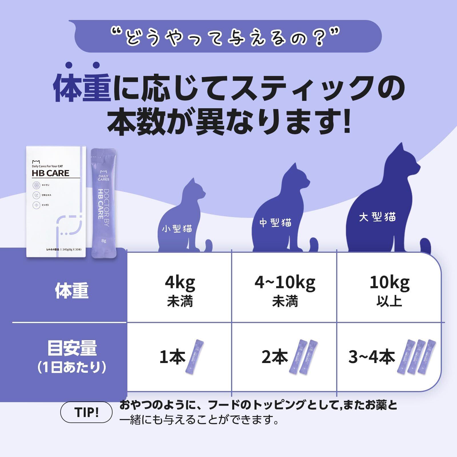 1日1回1本をエサ、おやつ、水と一緒にまたは製品をそのまま与えてください。