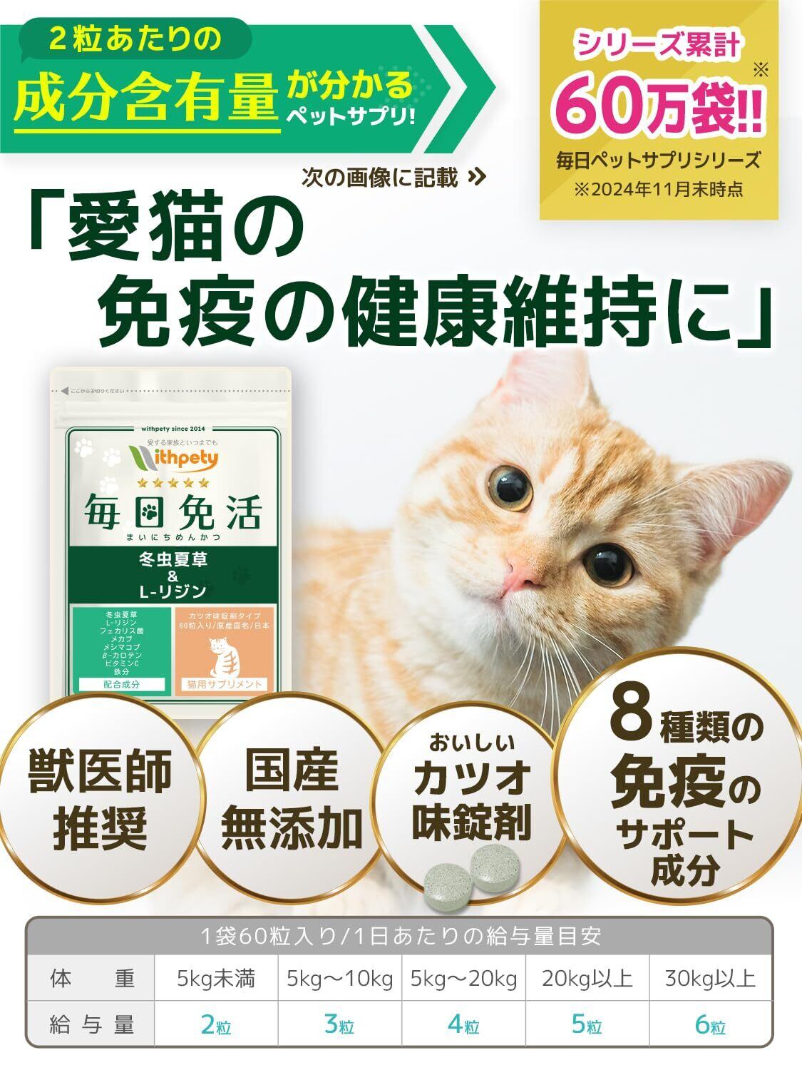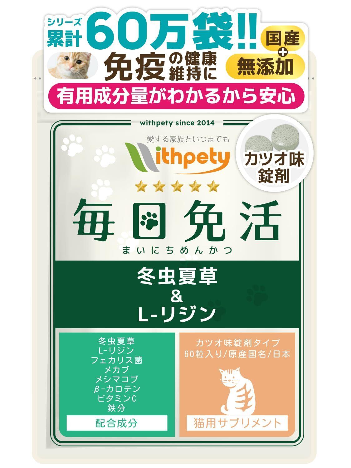 毎日免活 猫 免疫力 サプリ 国産 無添加 成分量明記【8成分配合】 冬虫夏草(カイコ由来サナギタケ/コルジセピン含有) L-リジン フェカリス菌 メカブ メシマコブ β-カロテン ビタミンC 鉄分 <カツオ味錠剤 猫用 サプリメント 1袋60粒入>[ウィズペティ公式]