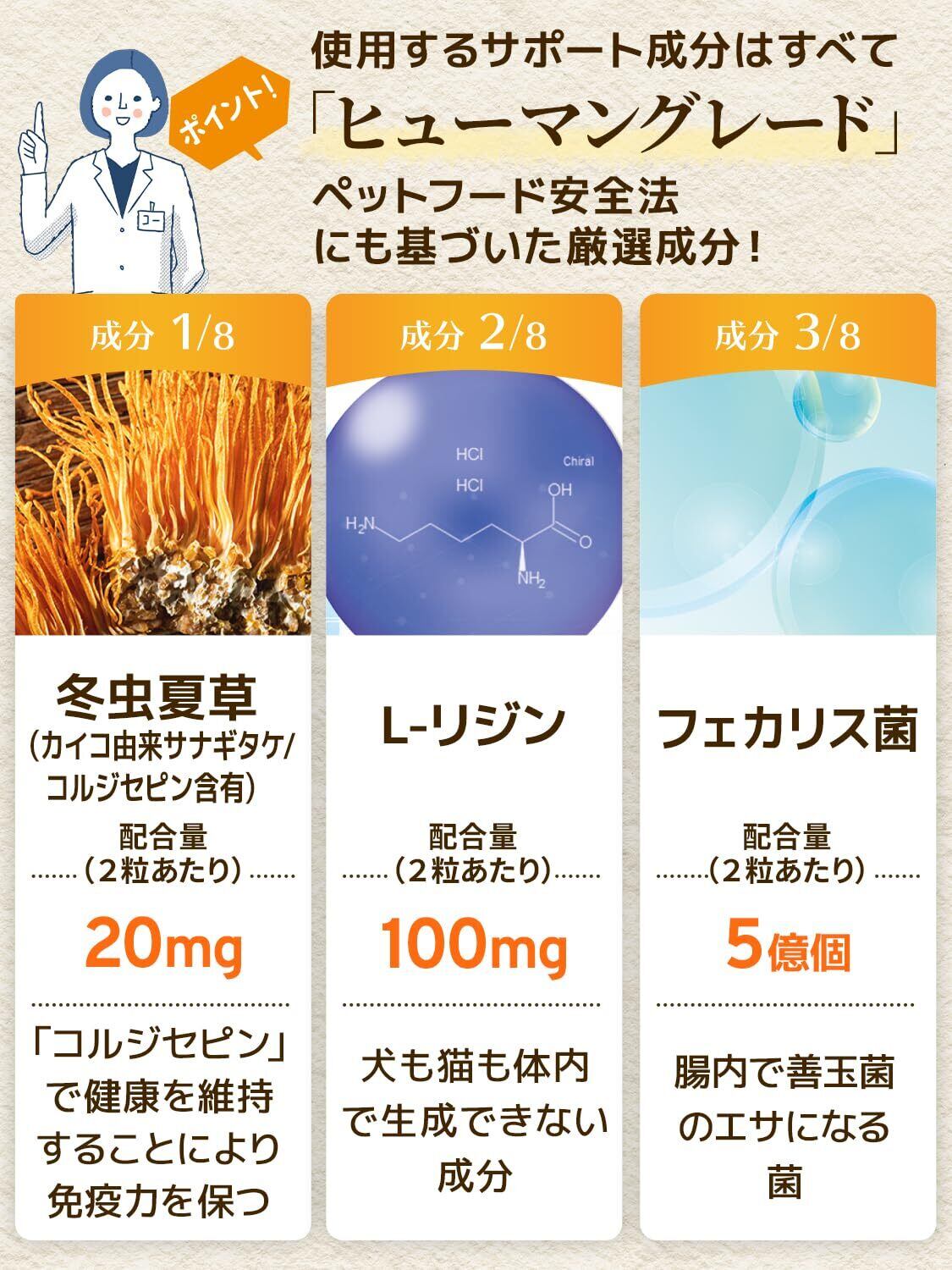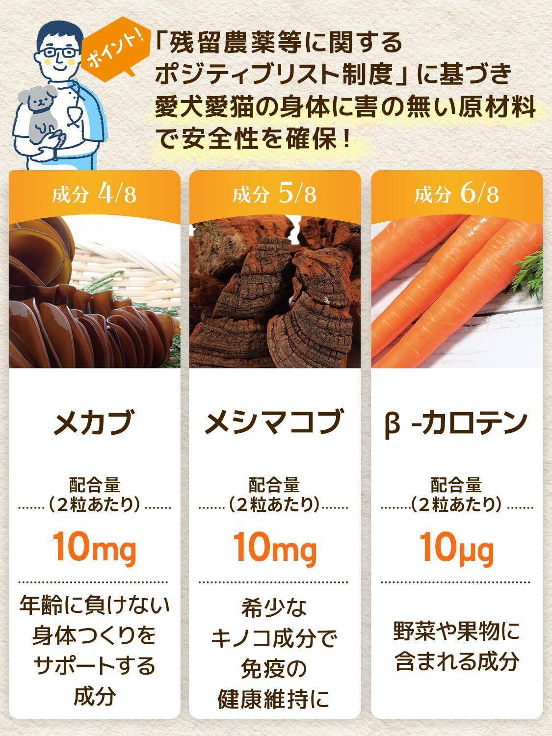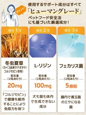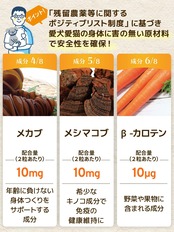 【成分配合量の表示】ウィズペティは原材料の表示だけではなく主成分の成分配合量も表示しております。大切な愛猫が口にするペットサプリメントを正しくご理解いただき長くご愛用頂く事が大切だと考えます。[猫用サプリ・免疫の健康維持:毎日免活 2粒あたりの主成分配合量/冬虫夏草 [カイコ由来サナギタケ](20mg)、L-リジン(100mg)、フェカリス菌(5億個)、メカブ(10mg)、メシマコブ(10mg)、β-カロテン(10μg)、ビタミンC(3mg)、鉄分(1mg)