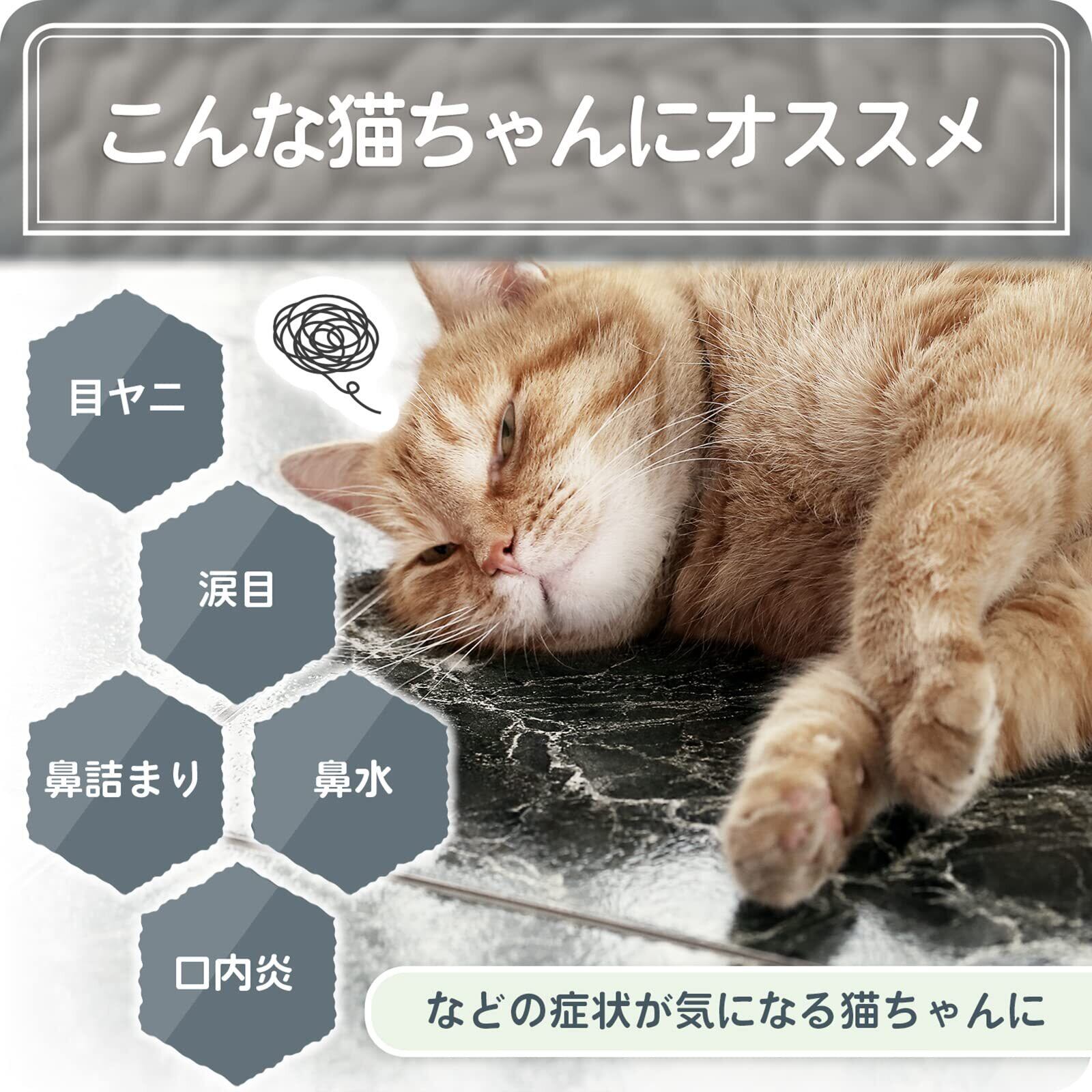 くしゃみ、鼻水、鼻詰まり、涙目、目ヤニ、口内炎などの症状が気になる猫ちゃんへオススメです。
