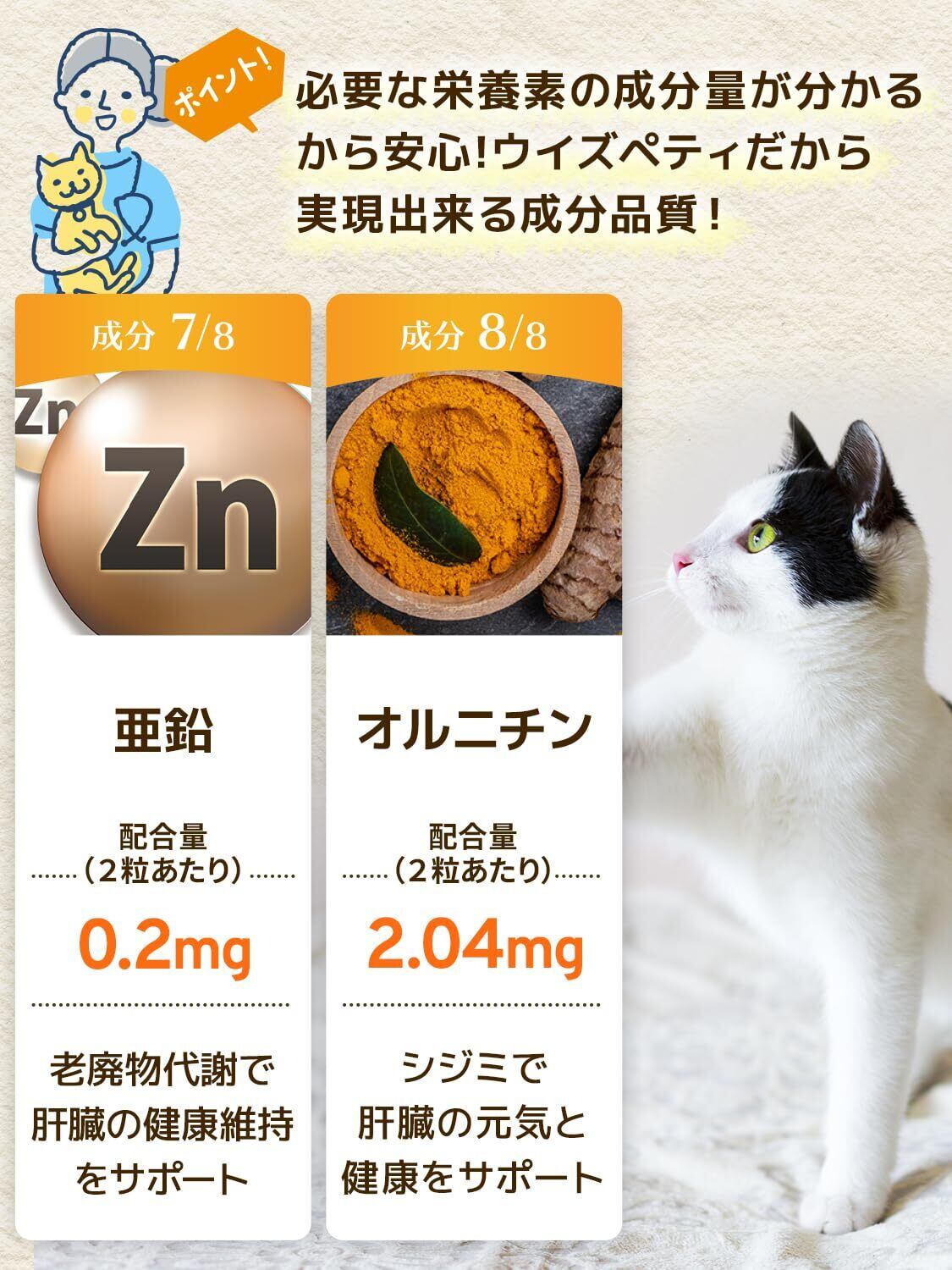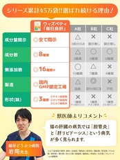 【成分配合量の表示】ウィズペティは原材料の表示だけではなく主成分の成分配合量も表示しております。大切な愛猫が口にするペットサプリメントを正しくご理解いただき長くご愛用頂く事が大切だと考えます。[猫用サプリ/肝臓の健康維持:毎日良肝 肝臓エキス&プラセンタ/2粒あたりの主成分配合量/肝臓加水分解物10.02mg、酵母10.02mg、プラセンタ 10.02mg、 BCAA 2.04mg、ウコン抽出物 2.04mg、マリアアザミエキス 2.04mg、亜鉛 0.2mg、オルニチン 2.04mg]
