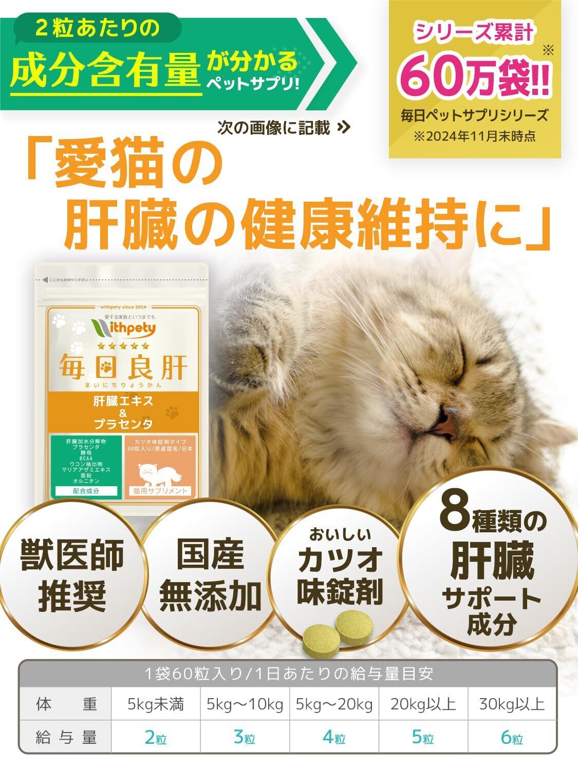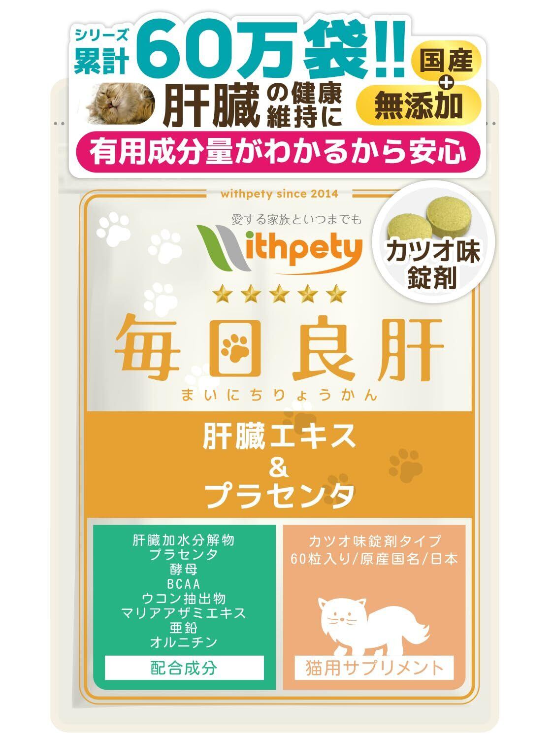 毎日良肝 猫 肝臓ケア サプリ 国産 無添加 成分量明記【8成分配合】 肝臓エキス プラセンタ 酵母 BCAA ウコン マリアアザミエキス 亜鉛 オルニチン <カツオ味錠剤 猫用 サプリメント 1袋60粒入>[ウィズペティ公式]