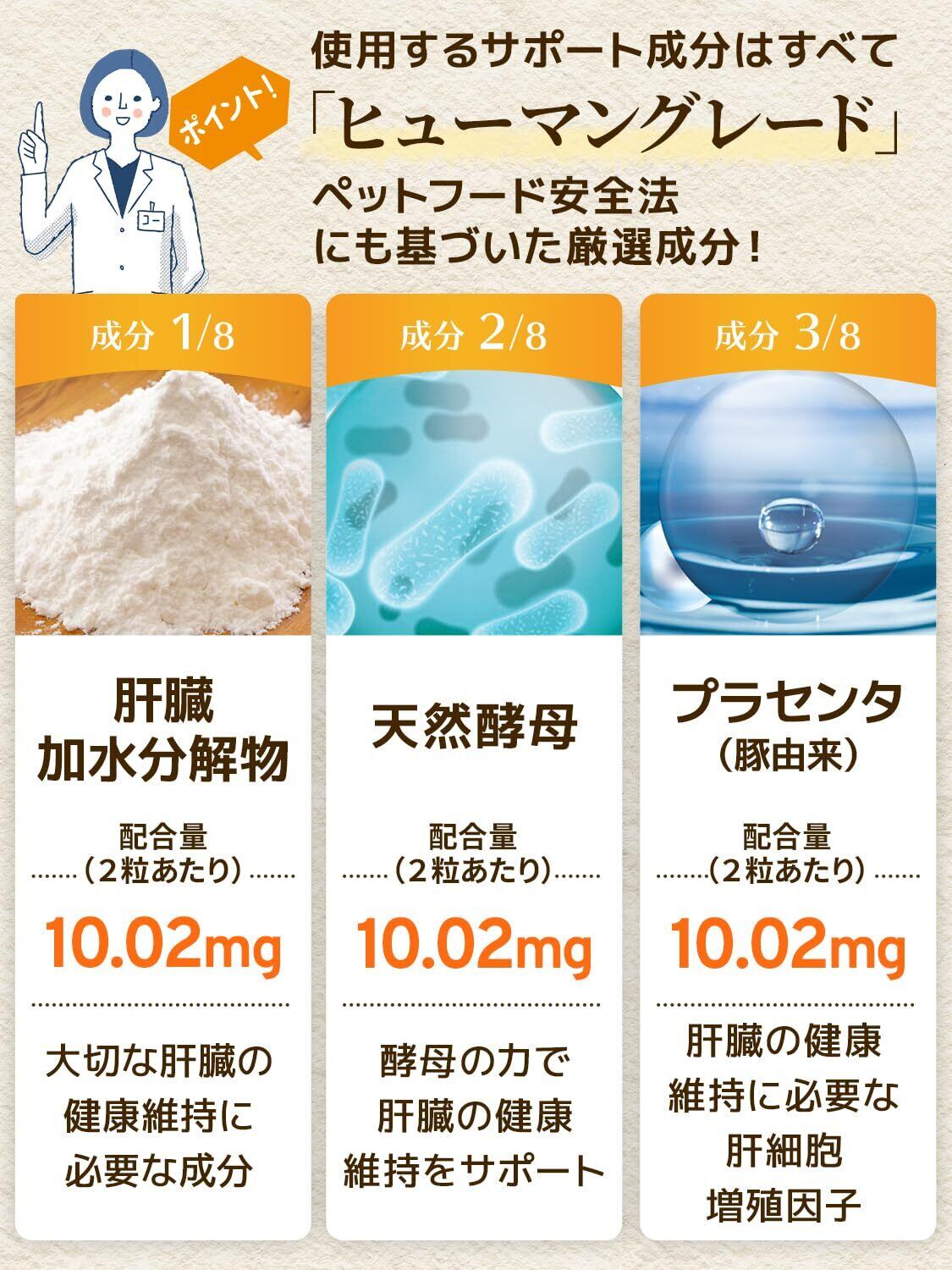 有効成分 肝臓加水分解物・プラセンタ・酵母・BCAA・ウコン・マリアアザミエキス・亜鉛・オルニチン