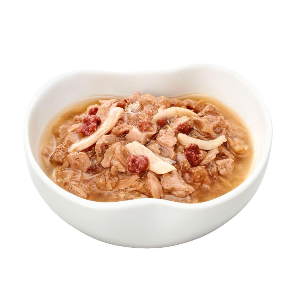 【原材料】魚介類(カツオ、マグロ、青魚、フィッシュペプチド)、肉類(鶏ささみ、鶏肉、牛肉)、油脂類(鶏脂、大豆油)、たんぱく加水分解物、小麦グルテン、糖類(ショ糖、オリゴ糖)、乾燥全卵、エンドウたんぱく、乾燥卵黄、増粘安定剤(加工でん粉、増粘多糖類)、調味料、ミネラル類(Ca、P、Fe、Cu、Mn、Zn、I、Se)、ポリリン酸Na、ビタミン類(A、D、E、K、B1、B2、B6、B12、ナイアシン、パントテン酸、葉酸、ビオチン、コリン)、キシロース、タウリン 【成分】たんぱく質6.8%以上、脂質1.5%以上、粗繊維0.1%以下、灰分2.8%以下、水分86.2%以下 【エネルギー】36kcal/袋
