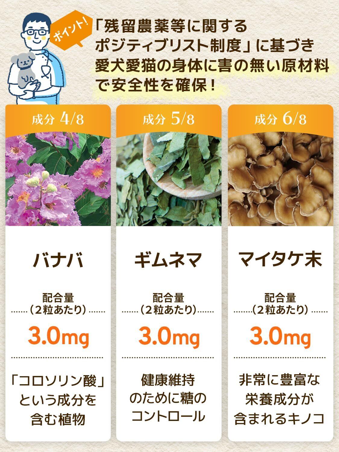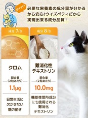 【成分配合量の表示】ウィズペティは原材料の表示だけではなく主成分の成分配合量も表示しております。大切な愛猫が口にするペットサプリメントを正しくご理解いただき長くご愛用頂く事が大切だと考えます。[猫の体重・糖尿・血糖値の健康維持のサプリ:毎日習慣 2粒あたりの主成分配合量/ サラシア(5.0mg)、イヌリン(50.0 mg)、桑の葉(3.0 mg)、バナバ(3.0 mg)、ギムネマ(3.0 mg)、マイタケ末(3.0 mg)、クロム(1.1ug)、難消化性デキストリン(10.0 mg)]