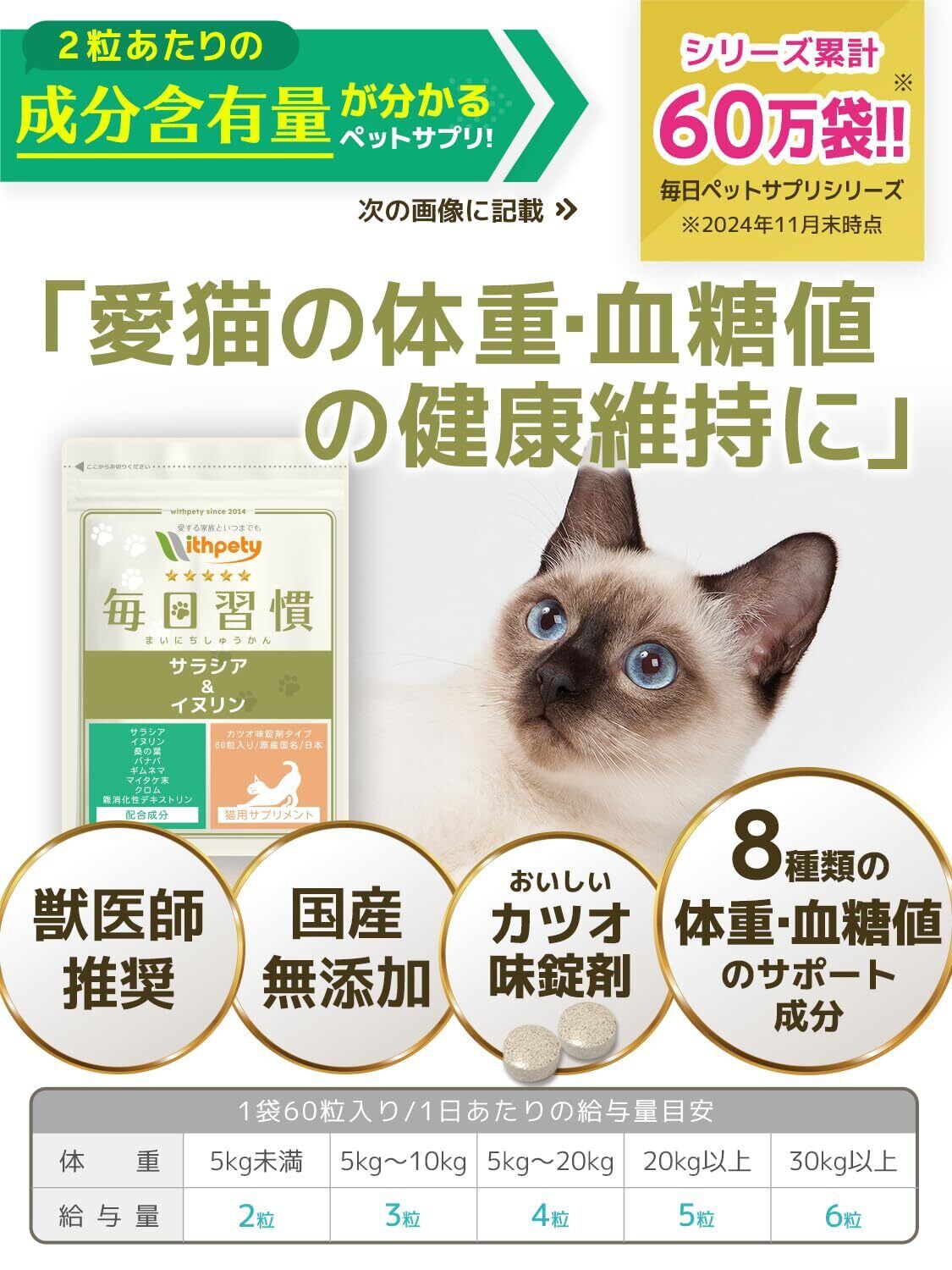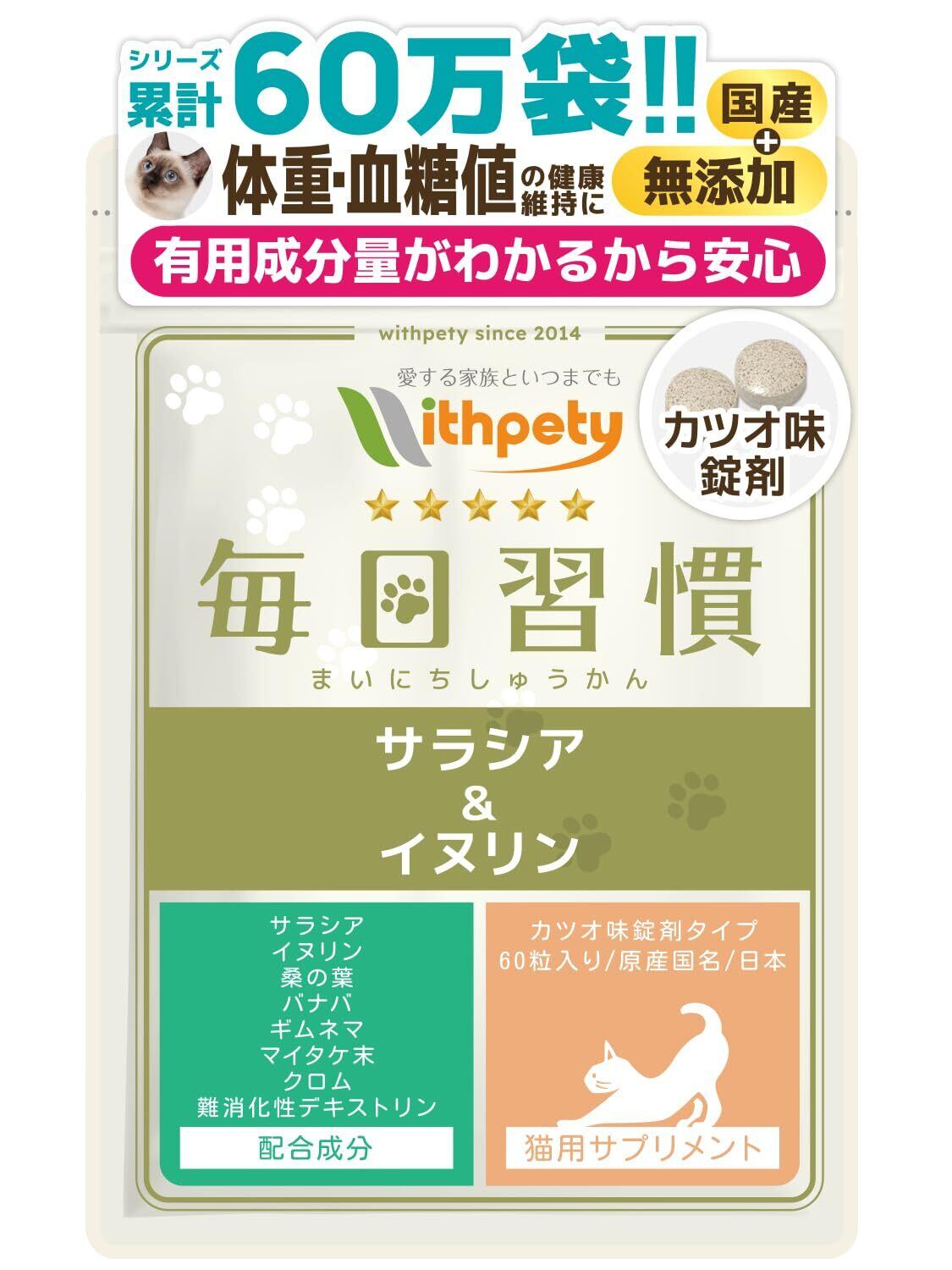 毎日習慣 猫 体重管理 血糖値ケア サプリ 国産 無添加 成分量明記【8成分配合】 サラシア イヌリン バナバ クロム マイタケ末 ギムネマ 桑の葉 難消化デキストリン <カツオ味錠剤 猫用 サプリメント 1袋60粒入>[ウィズペティ公式]